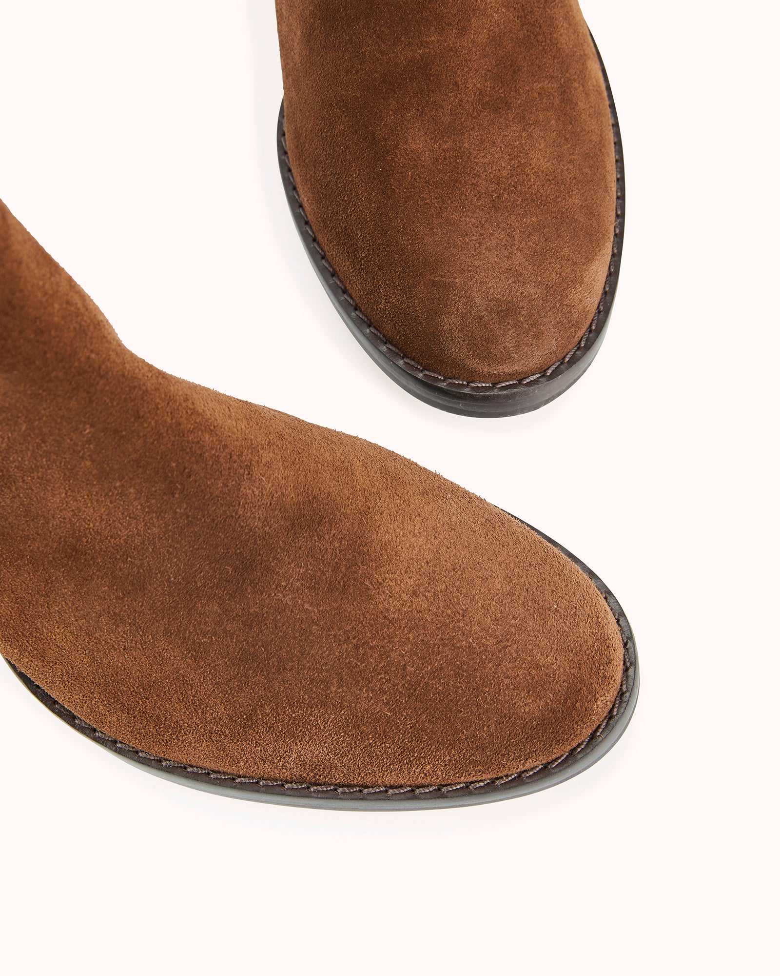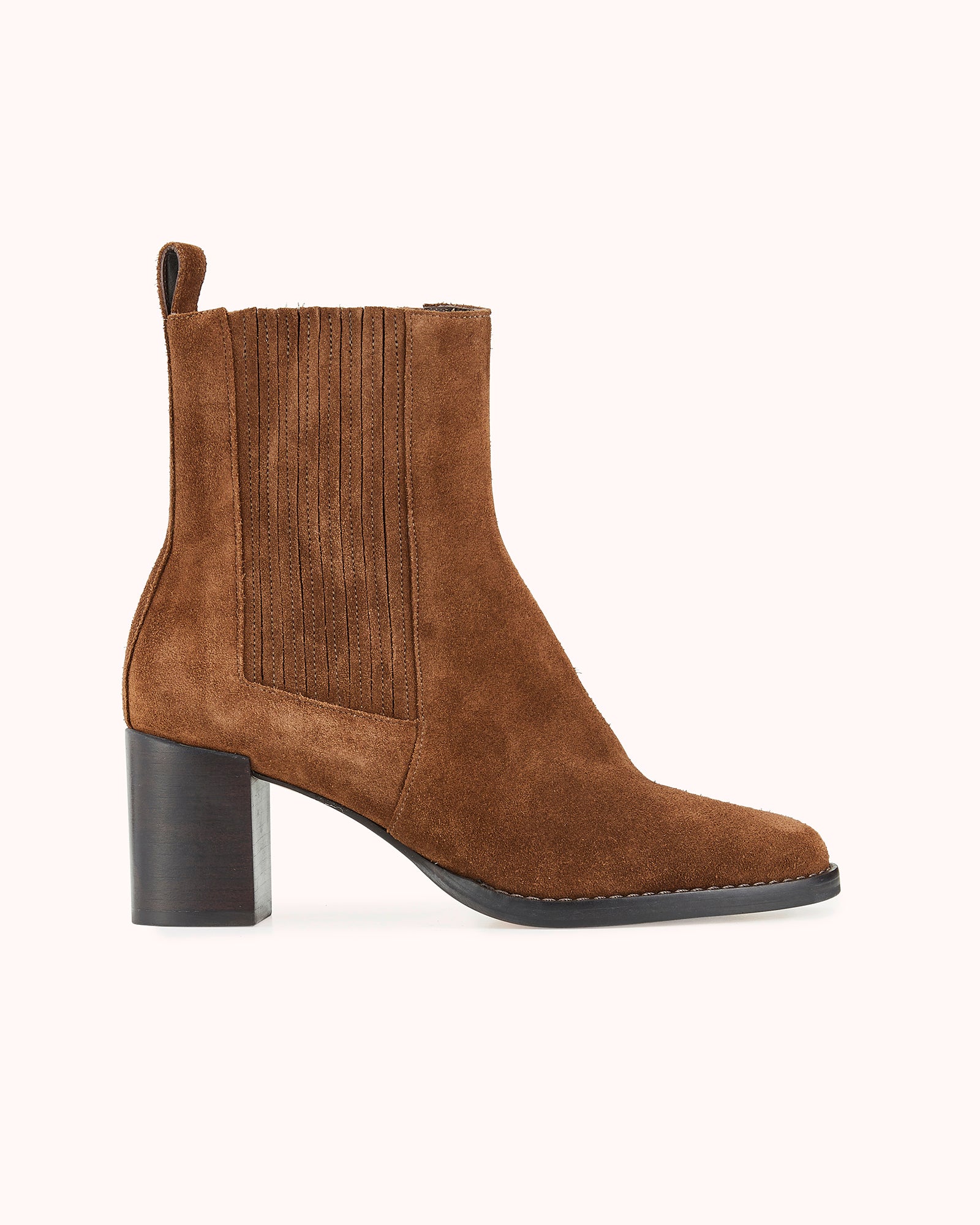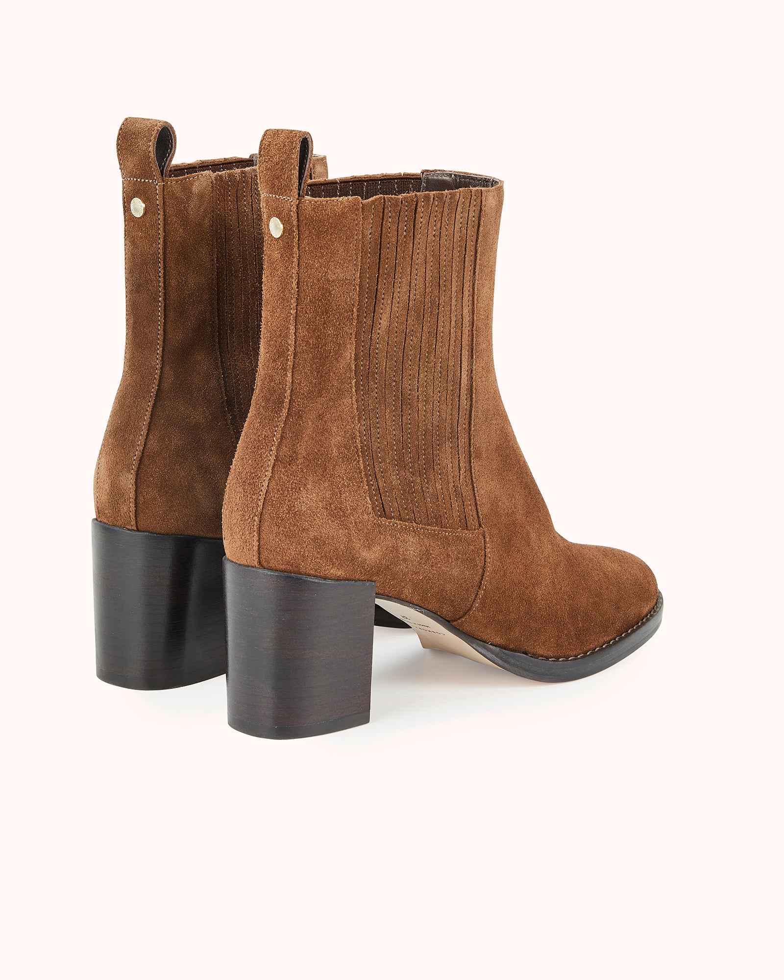 Our BELLA is a 6 cm heeled ankle boot. Its Chelsea upper with elastic and square heel are a guarantee of unfailing comfort. In chocolate brown suede calfskin, it is the ideal pair to accompany you throughout the winter.