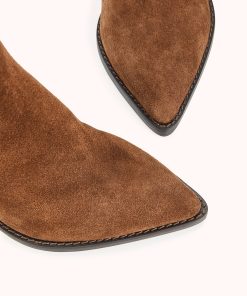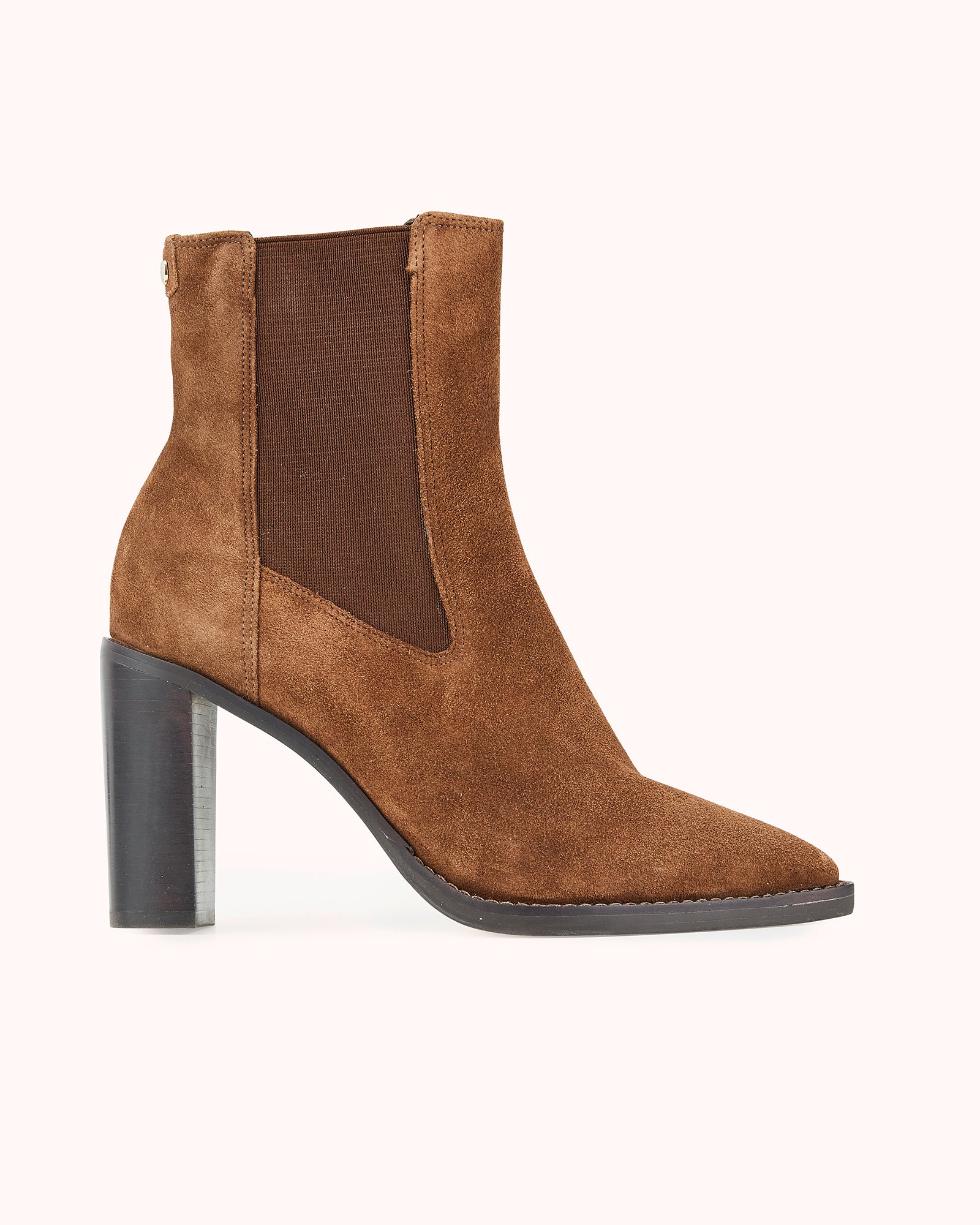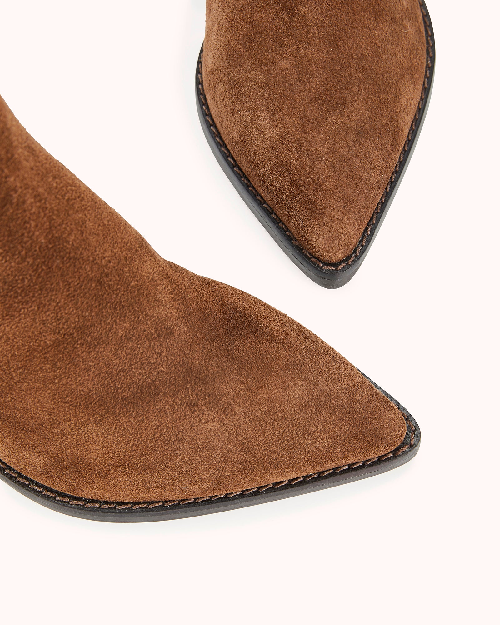 Our BETTY is a chocolate brown suede ankle boot with a thick heel, ensuring comfort and stability. Its 9 cm heel and pointed toe are the perfect combo between a western-inspired and ultra-feminine model.