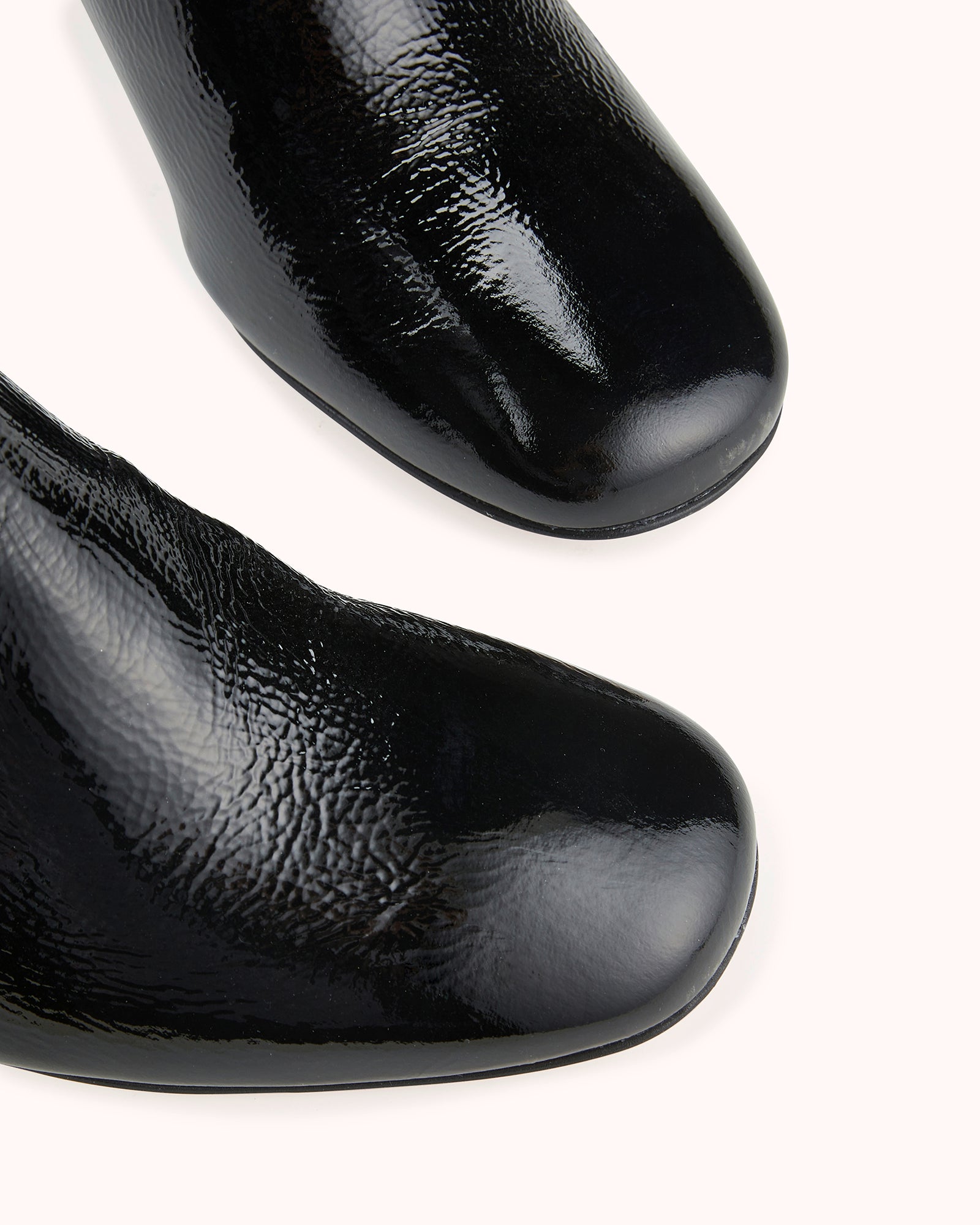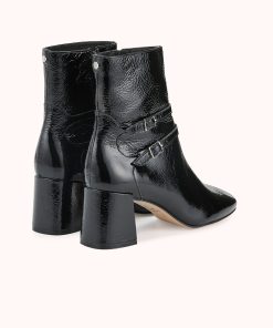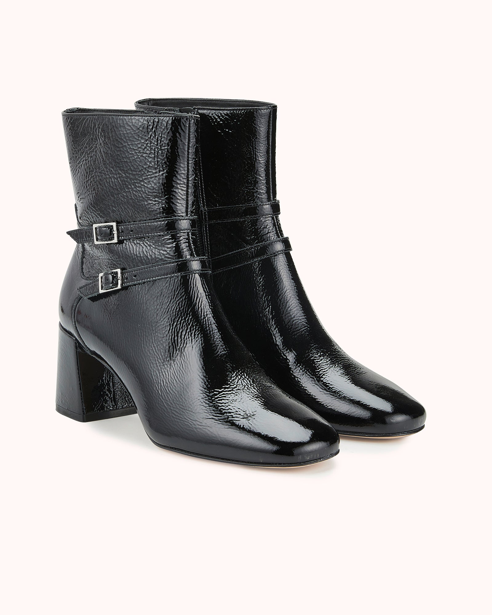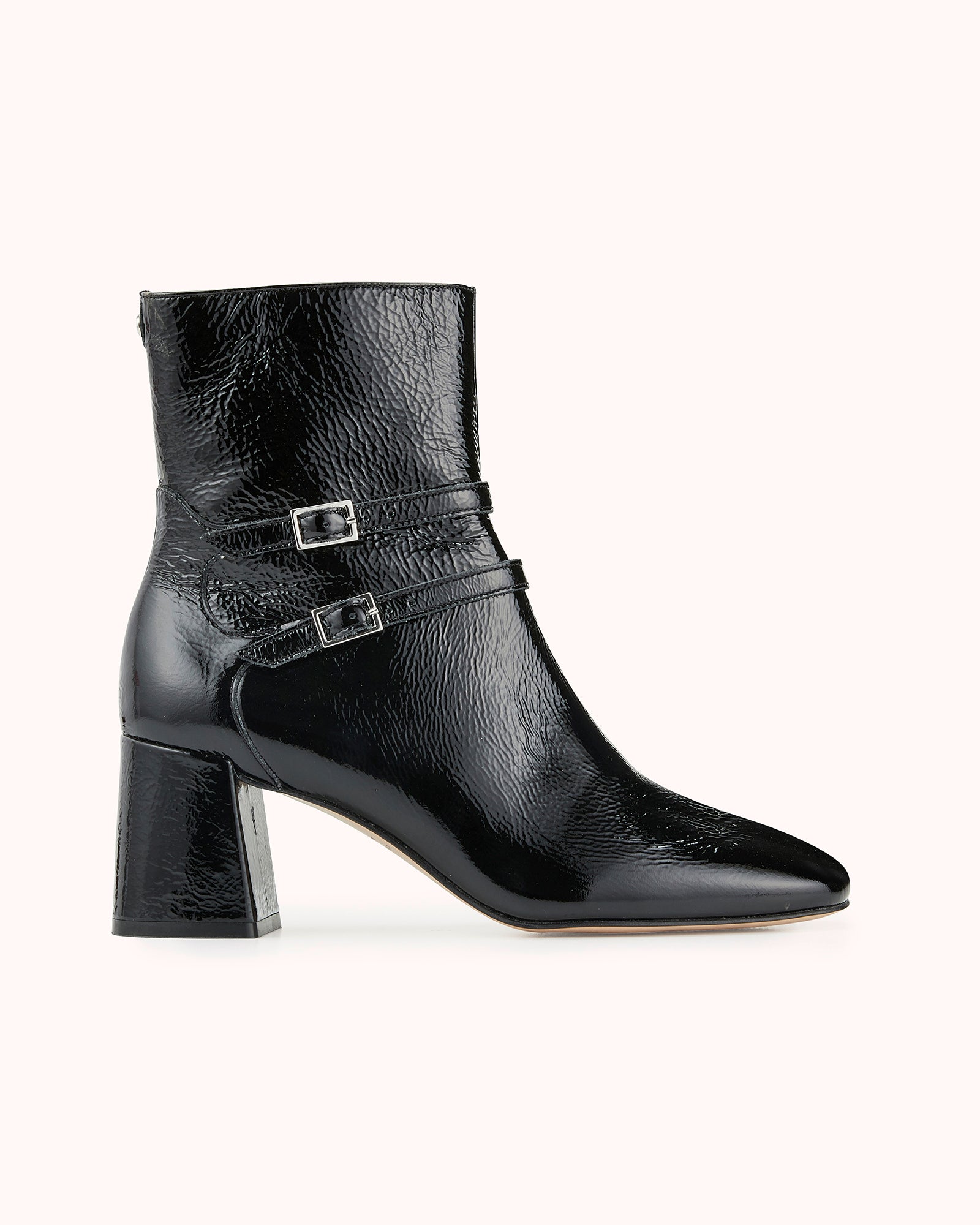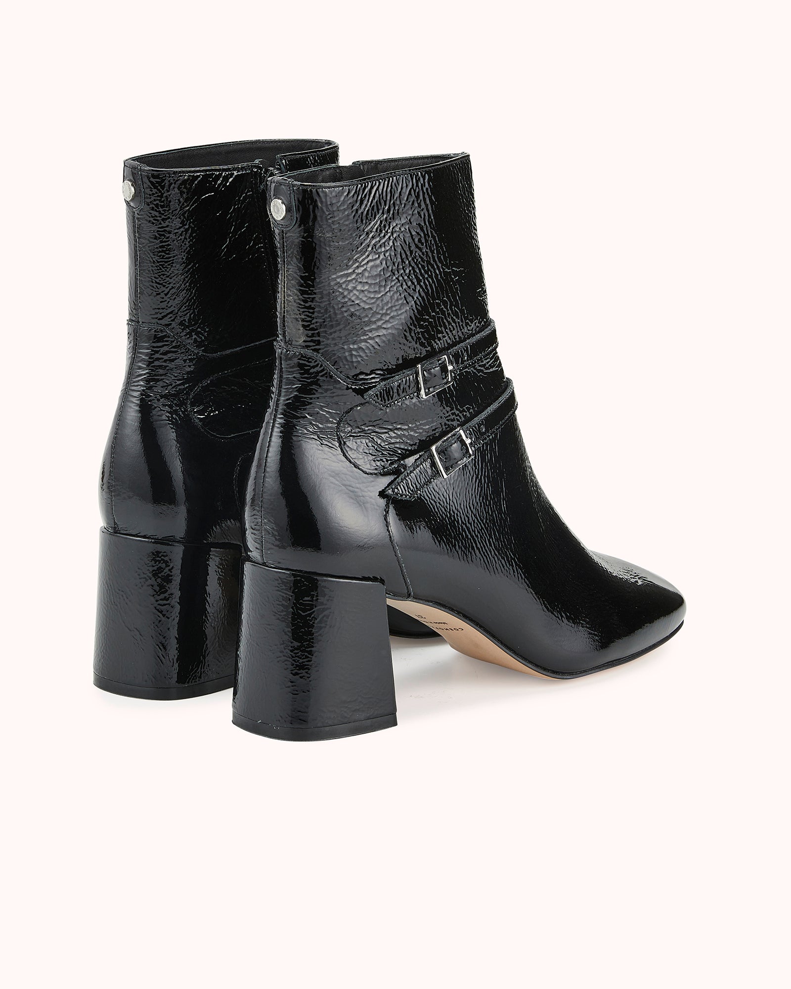 Make a splash with our BLANCA ankle boot. Its slightly flair and thick heel will provide you with all the comfort you need for everyday use. In black naplack leather and adorned with two thin straps with silver buckles, it will be the new centerpiece of your wardrobe.