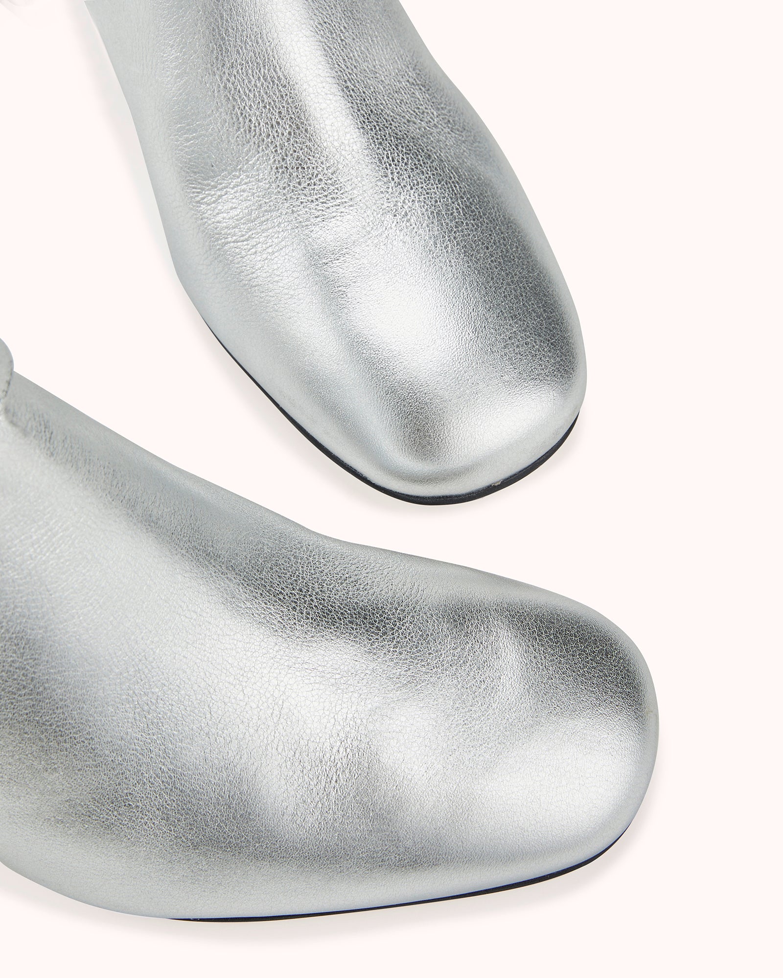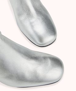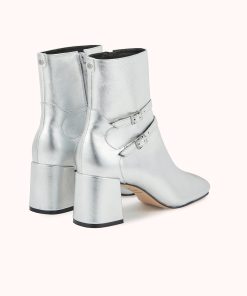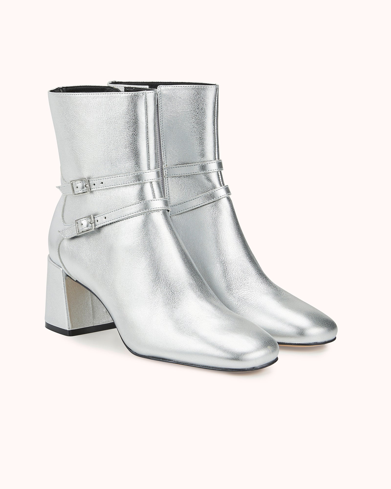 Make a splash with our BLANCA ankle boot. Its slightly flair and thick heel will provide you with all the comfort you need for everyday wear. In silver metallic leather and adorned with two thin straps with silver buckles, it will be the new centerpiece of your wardrobe.