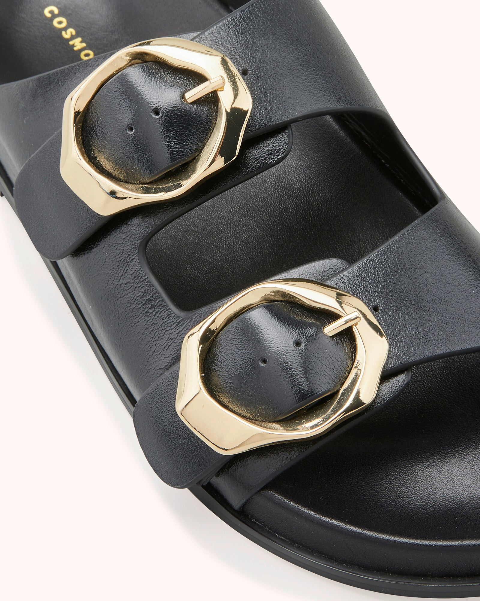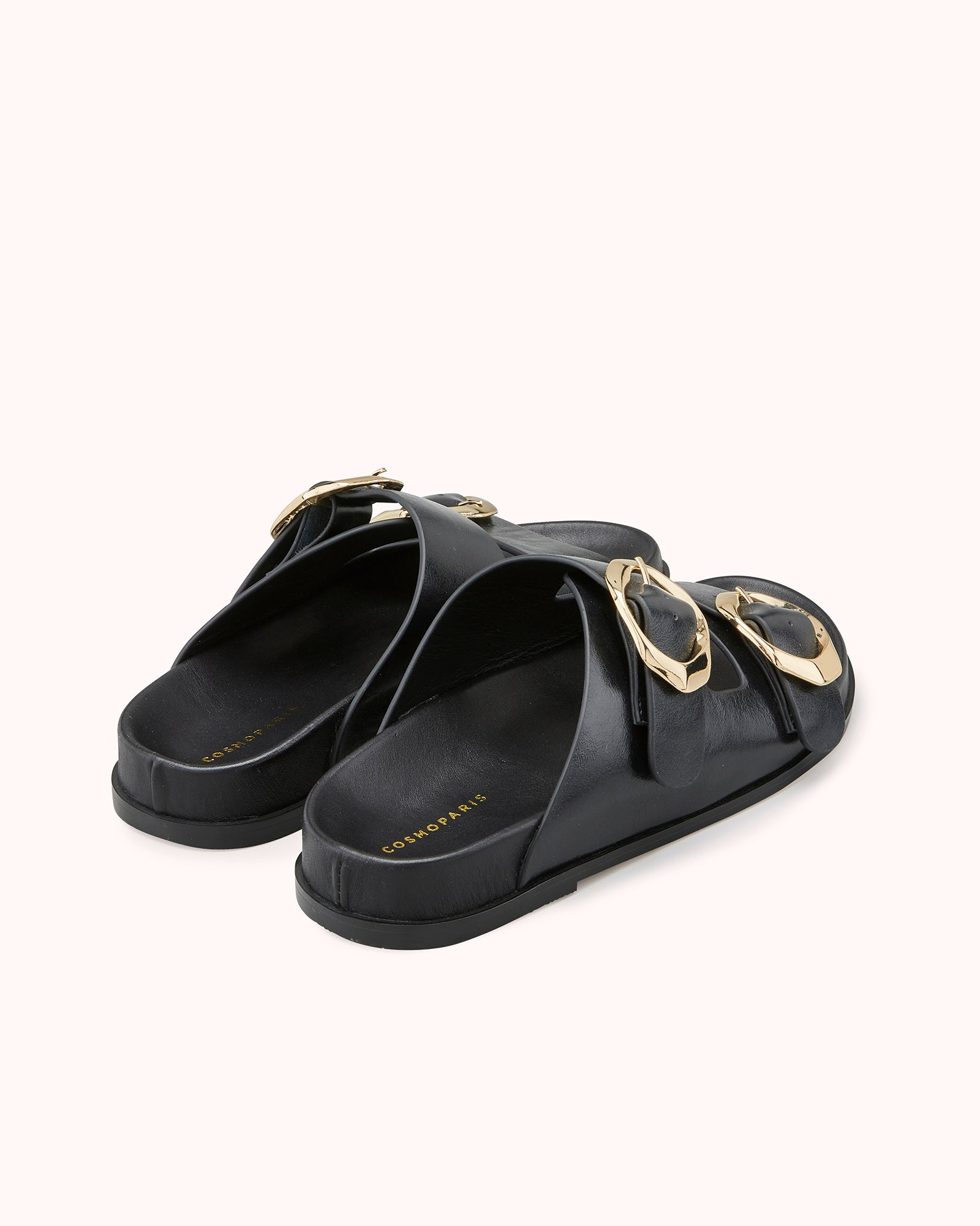 Coup de cœur des équipes Cosmoparis, découvrez notre mule plate CAMILA, en cuir lisse noir. Avec ses deux jolies boucles dorées asymétriques, elle est la paire tendance et confort à avoir cet été.