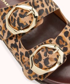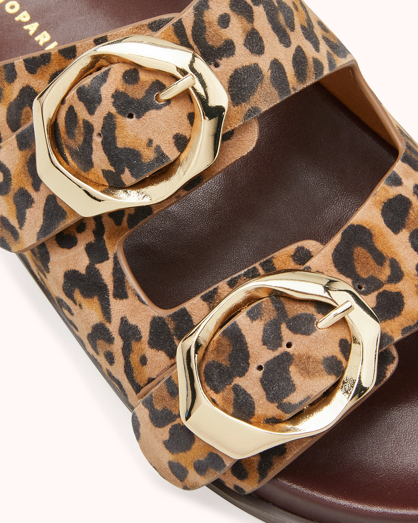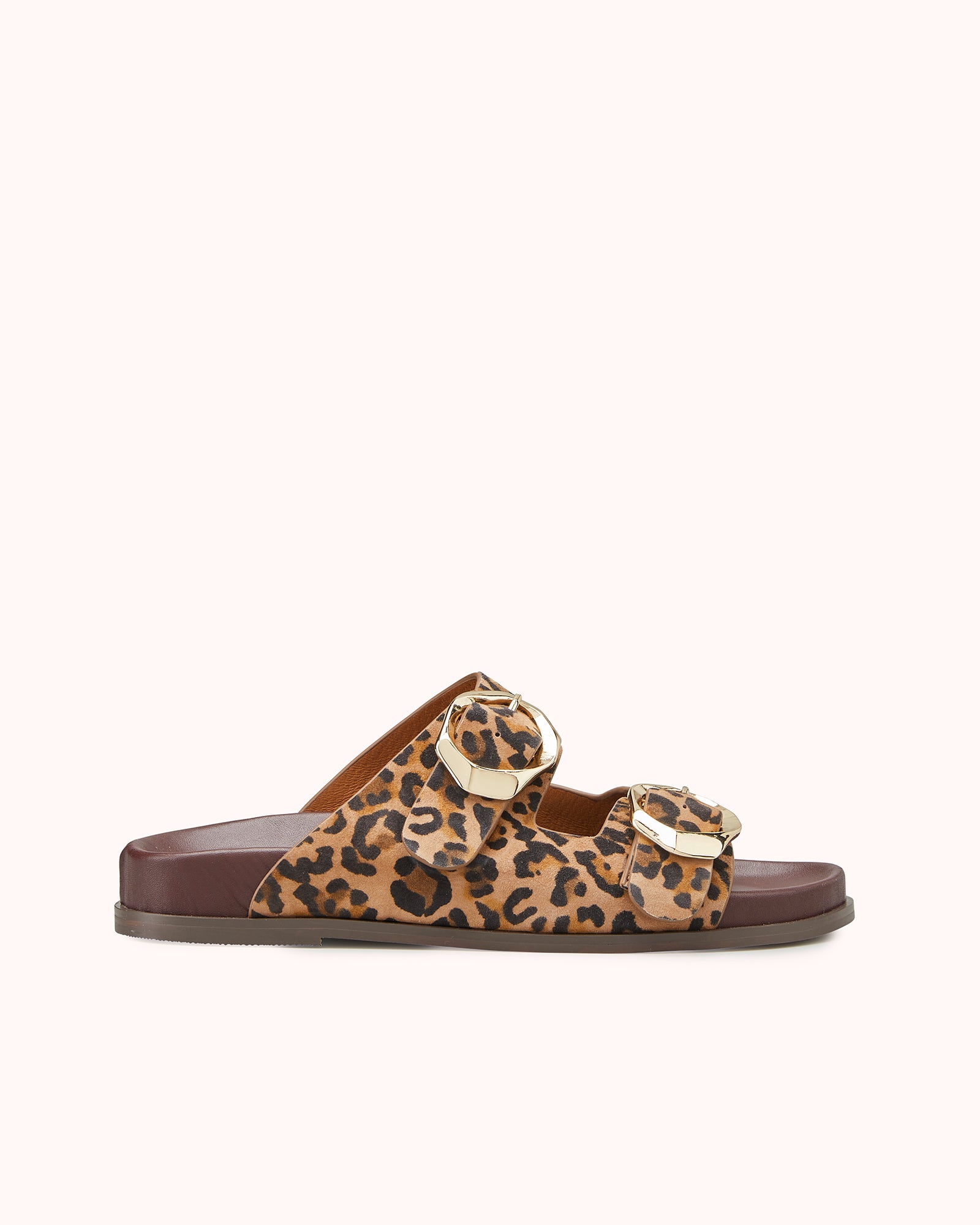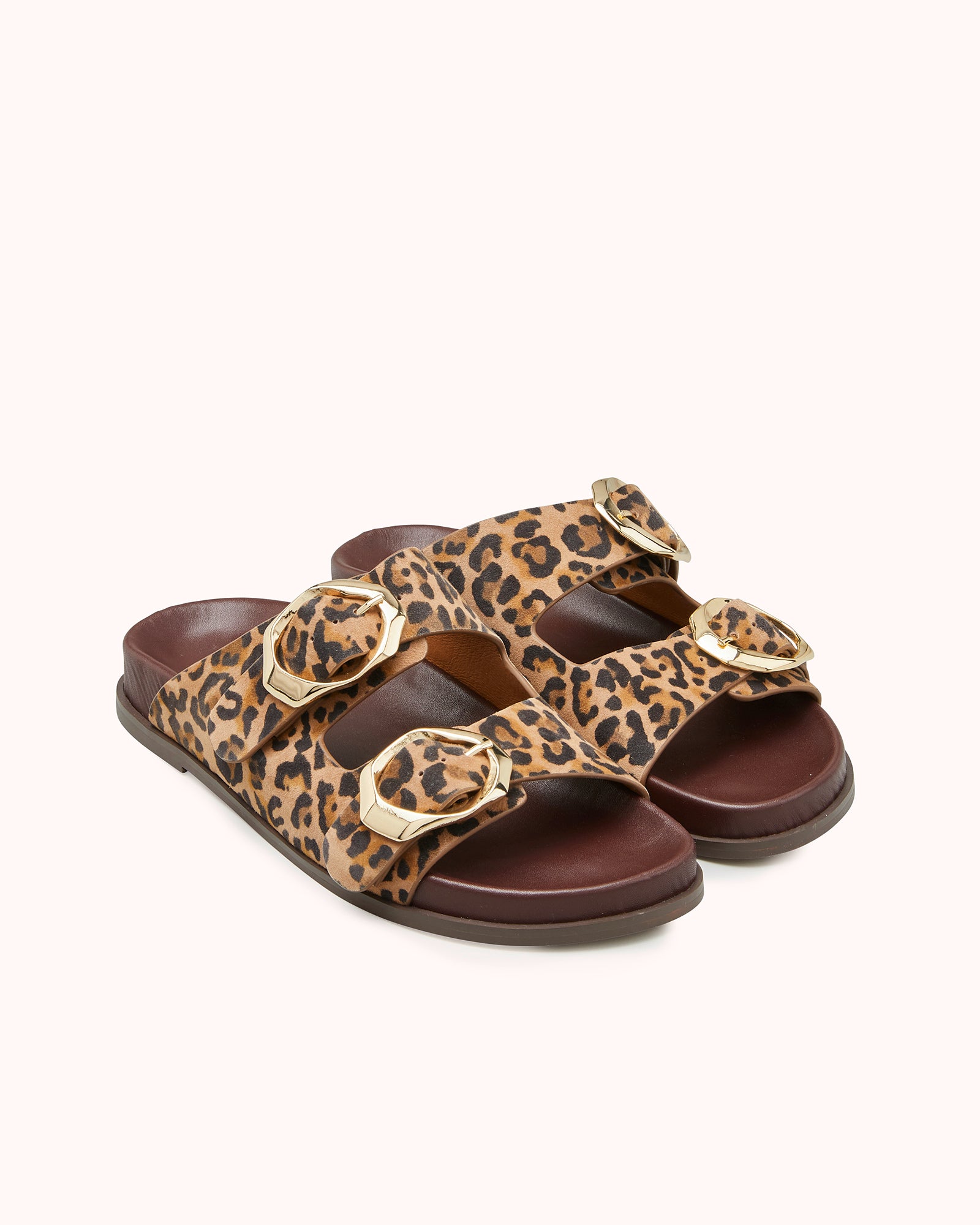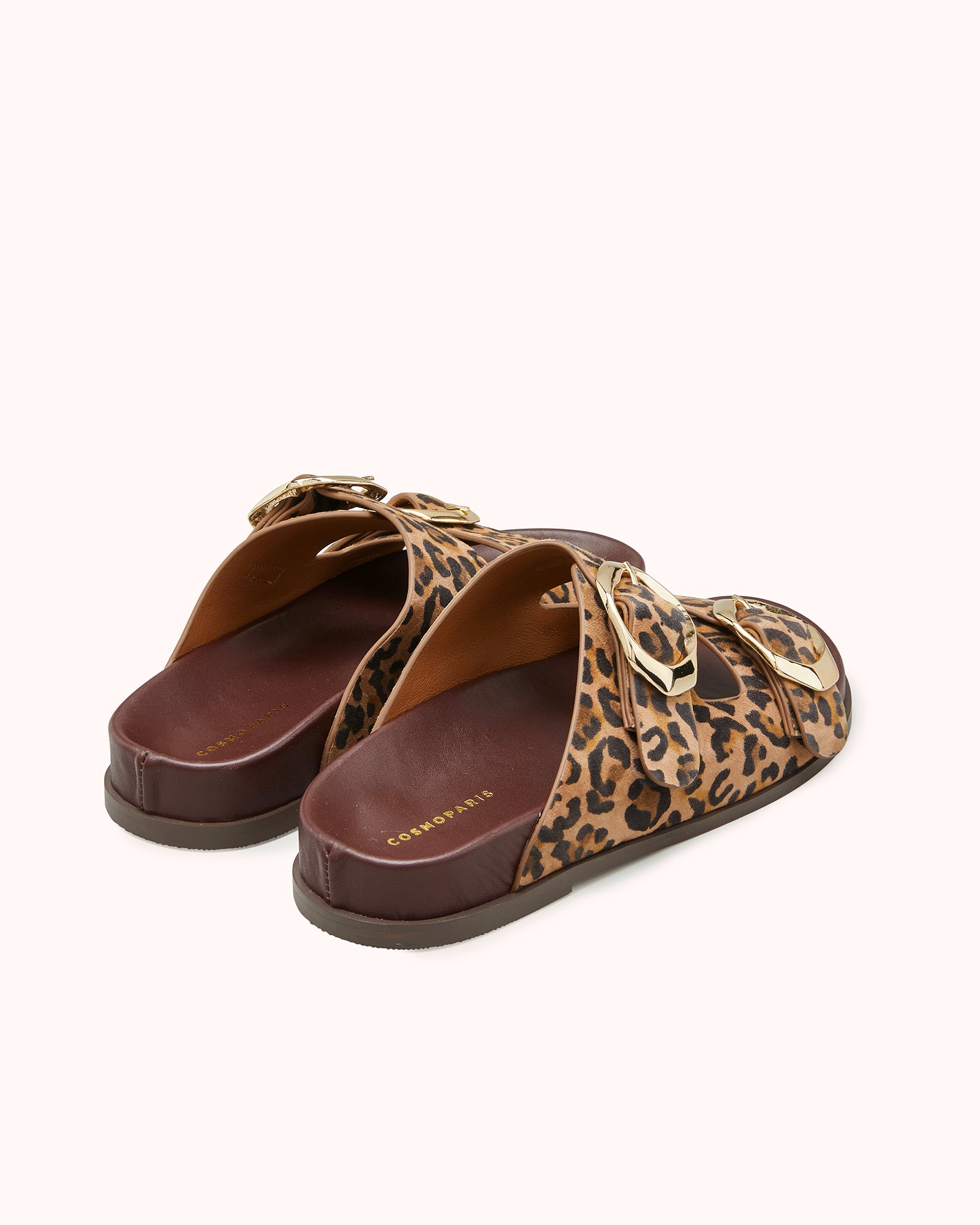 Déclinée en cuir chèvre velours, son motif léopard ne vous laissera pas indifférente. Son design orné de deux jolies boucles dorées et sa semelle hyper confortable “footbed” feront d’elle votre nouvel indispensable.