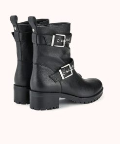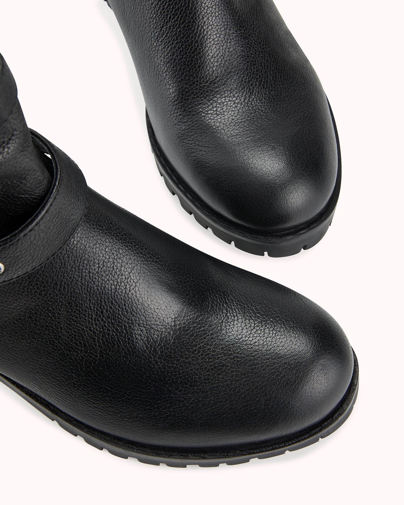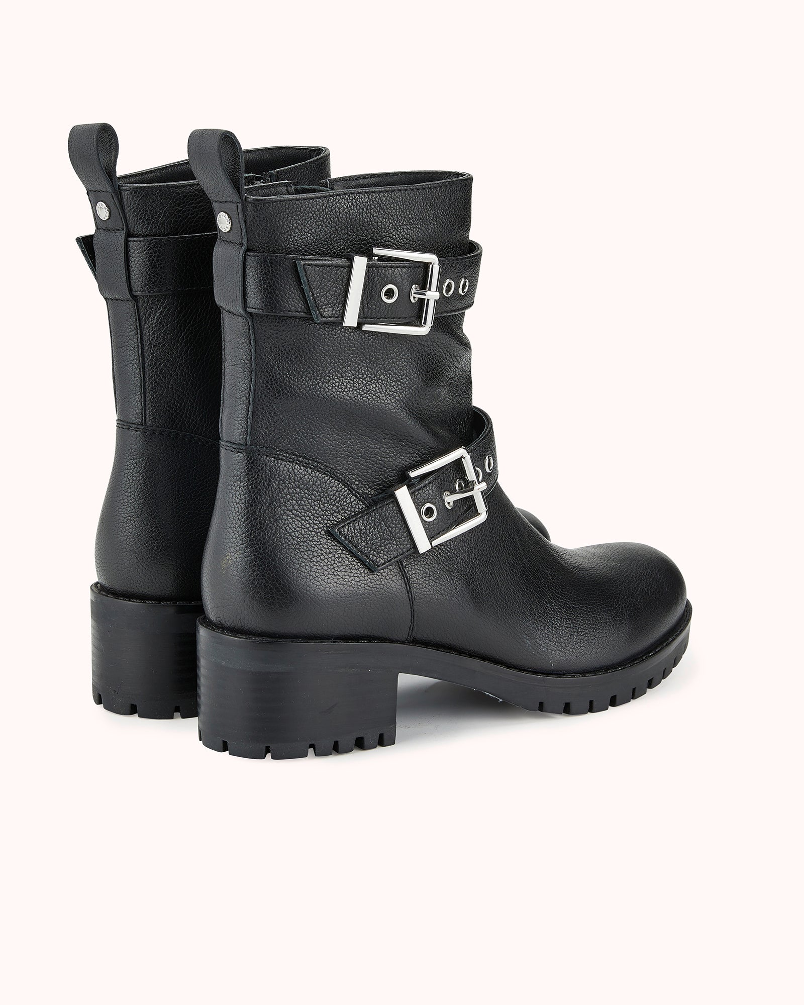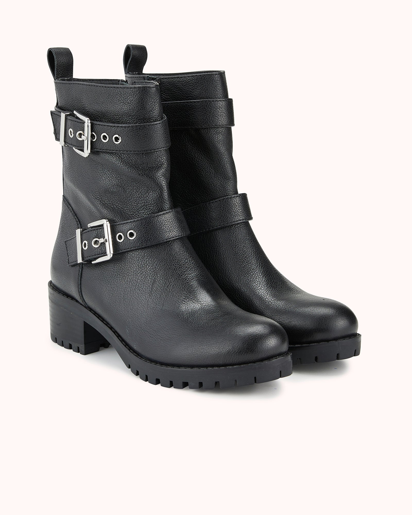 Our DANAE model is a boot with a small 5 cm heel and a notched sole. Its black grained leather upper is adorned with pretty silver buckles. This biker-style model is the trend of the season.