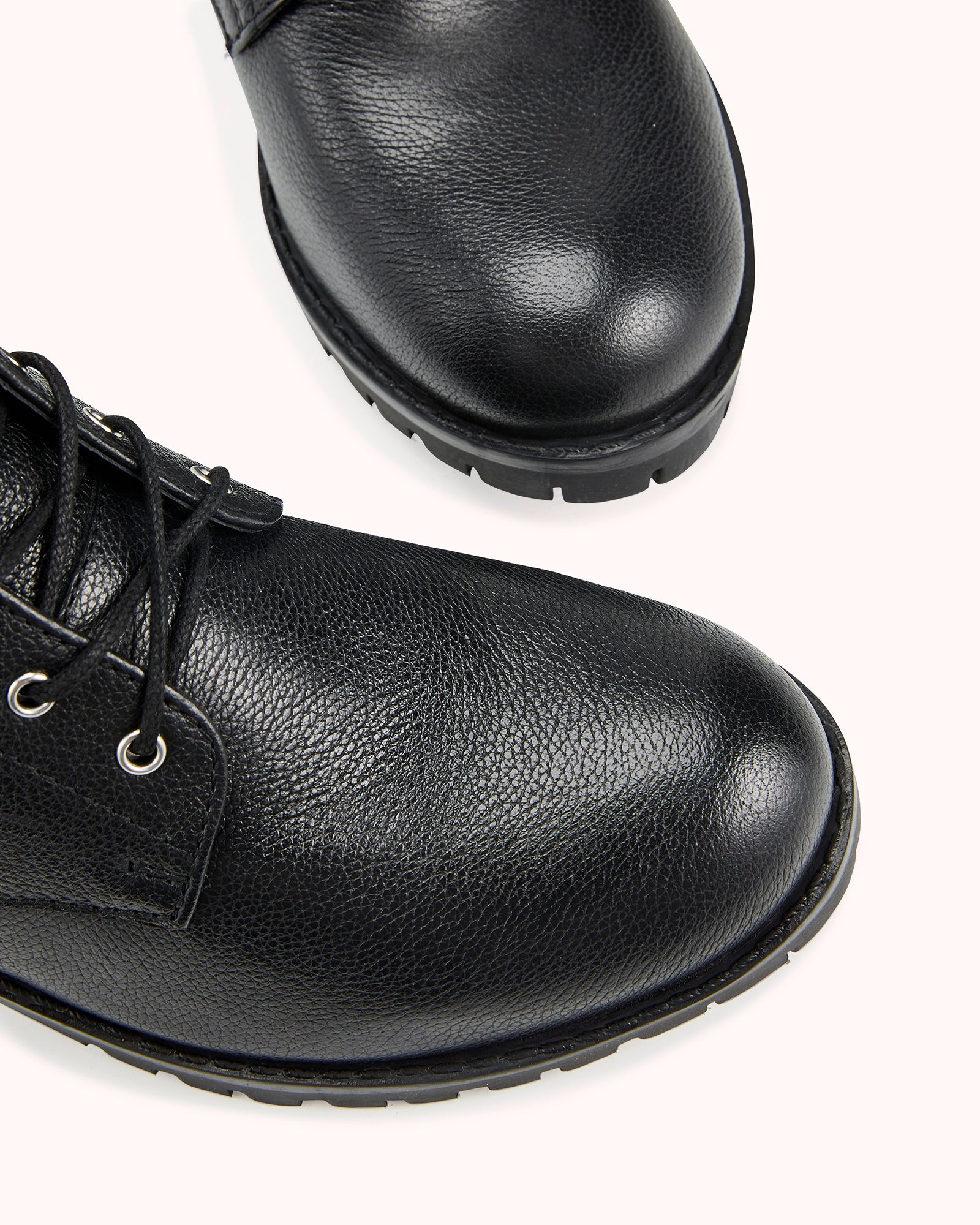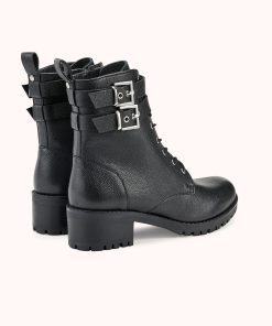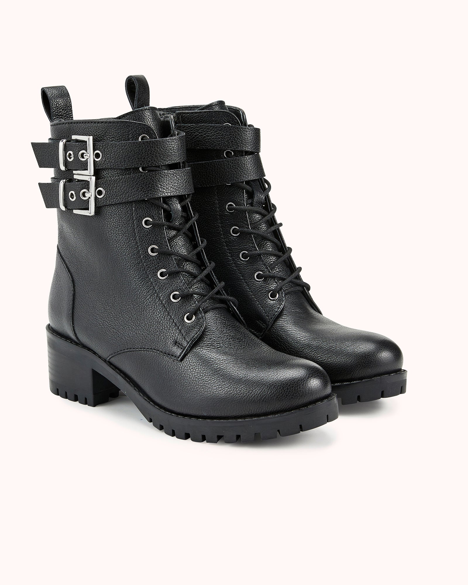 Our DAVINA model is a lace-up boot with a small 5 cm heel and a notched sole. Its black grained leather upper is adorned with pretty silver buckles on the ankle. This ranger-style model, ideal for winter, will enhance all your looks.