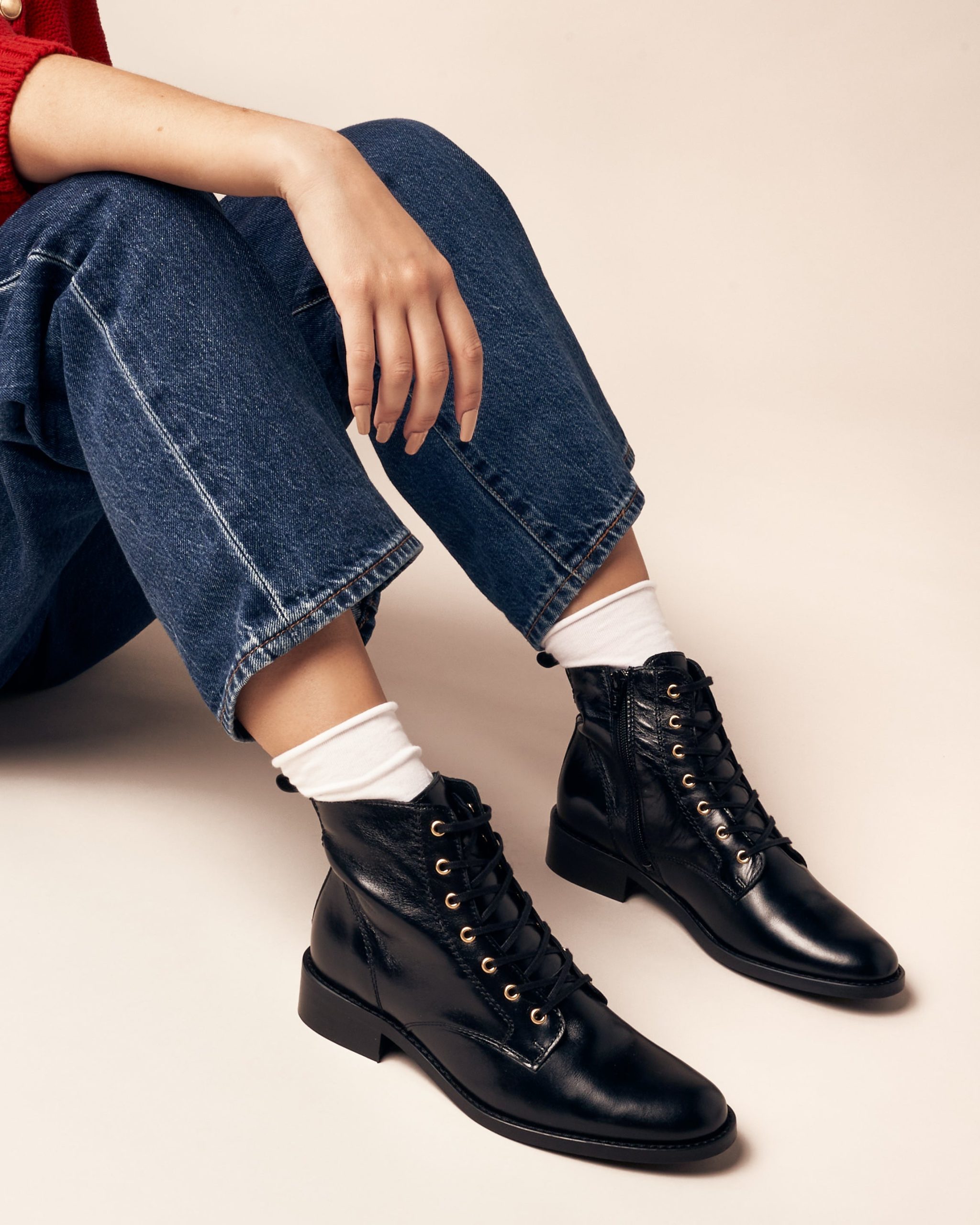 The FIBI is a flat ankle boot available in smooth black or slightly shiny brown leather and in leopard pony leather. Its golden eyelets give it a trendy and feminine touch. The FIBI will be your best asset for everyday looks. If you hesitate between two sizes, we recommend that you take the size above.