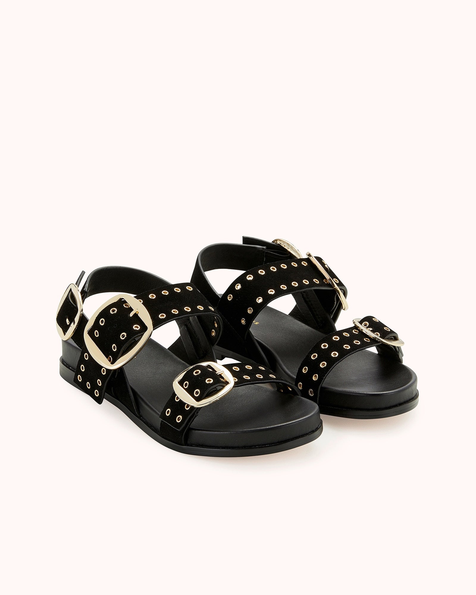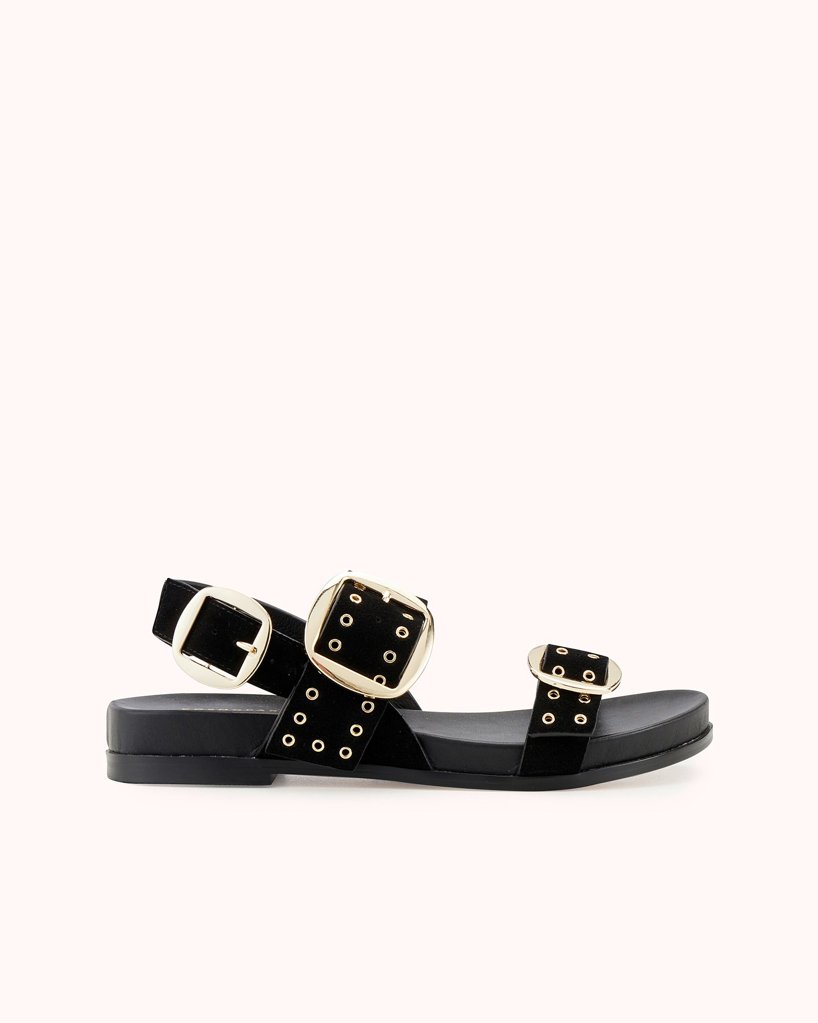 The HASSA sandal is the little sister of our iconic HASSI. Adorned with small eyelets and pretty metal buckles and available in linen or black suede, it is the ideal pair of feminine and comfortable flat sandals. This model is made with leather from tanneries certified by the Leather Working Group at the “gold” level.