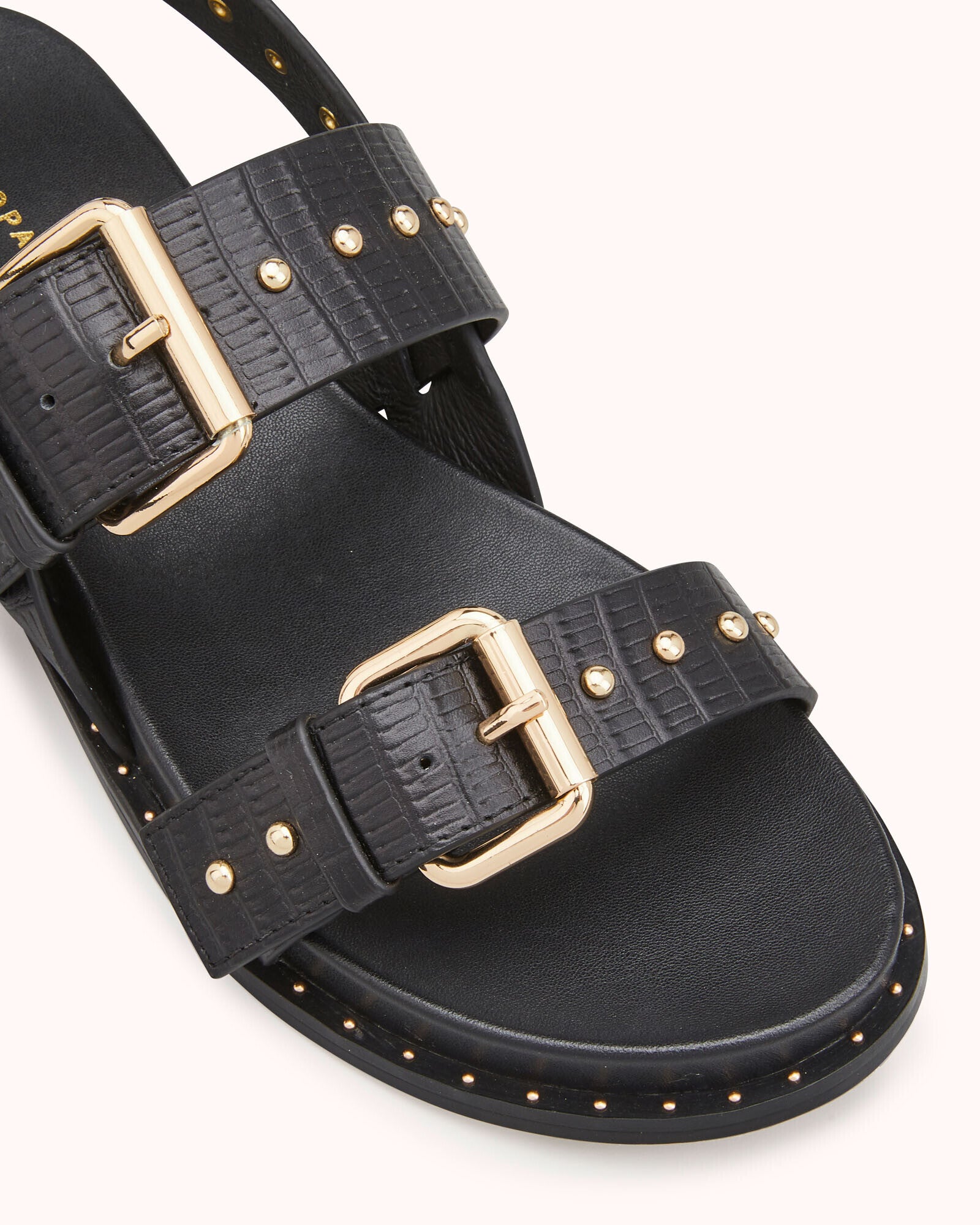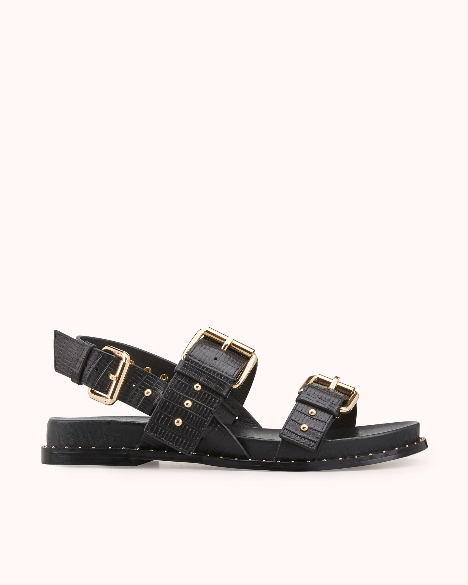 HASSI is a flat sandal with a neo-rock and very urban look thanks to its multi-buckle upper decorated with gold studs. In black or brown suede goatskin, this very trendy model will adapt to all your outfits. This model is made with leather from tanneries certified by the Leather Working Group at the “gold” level