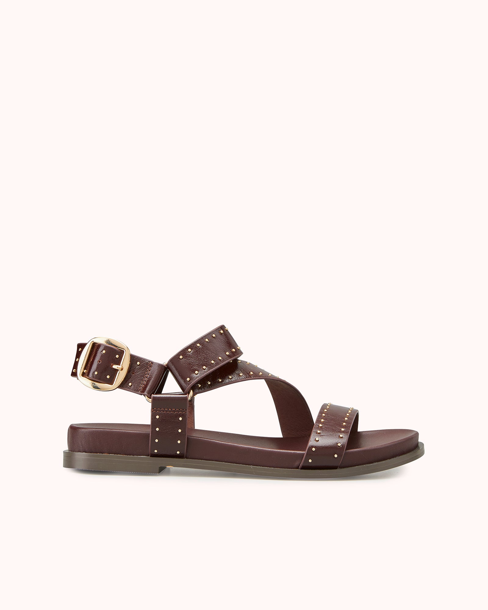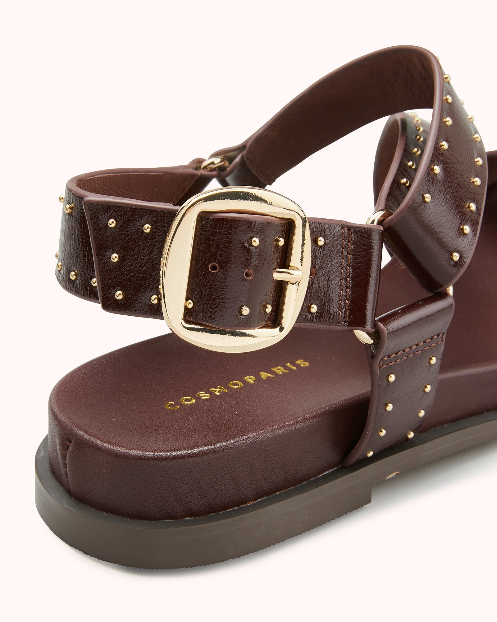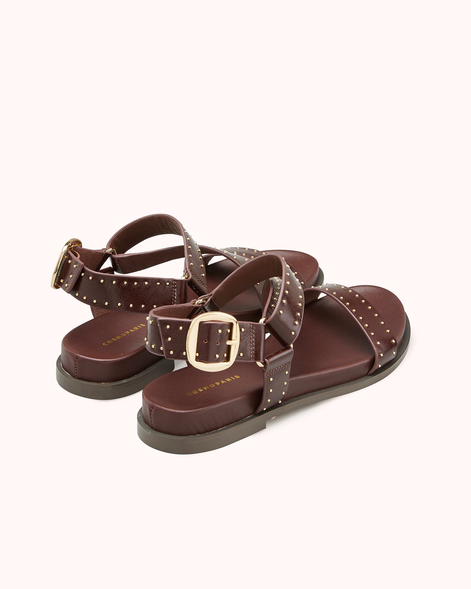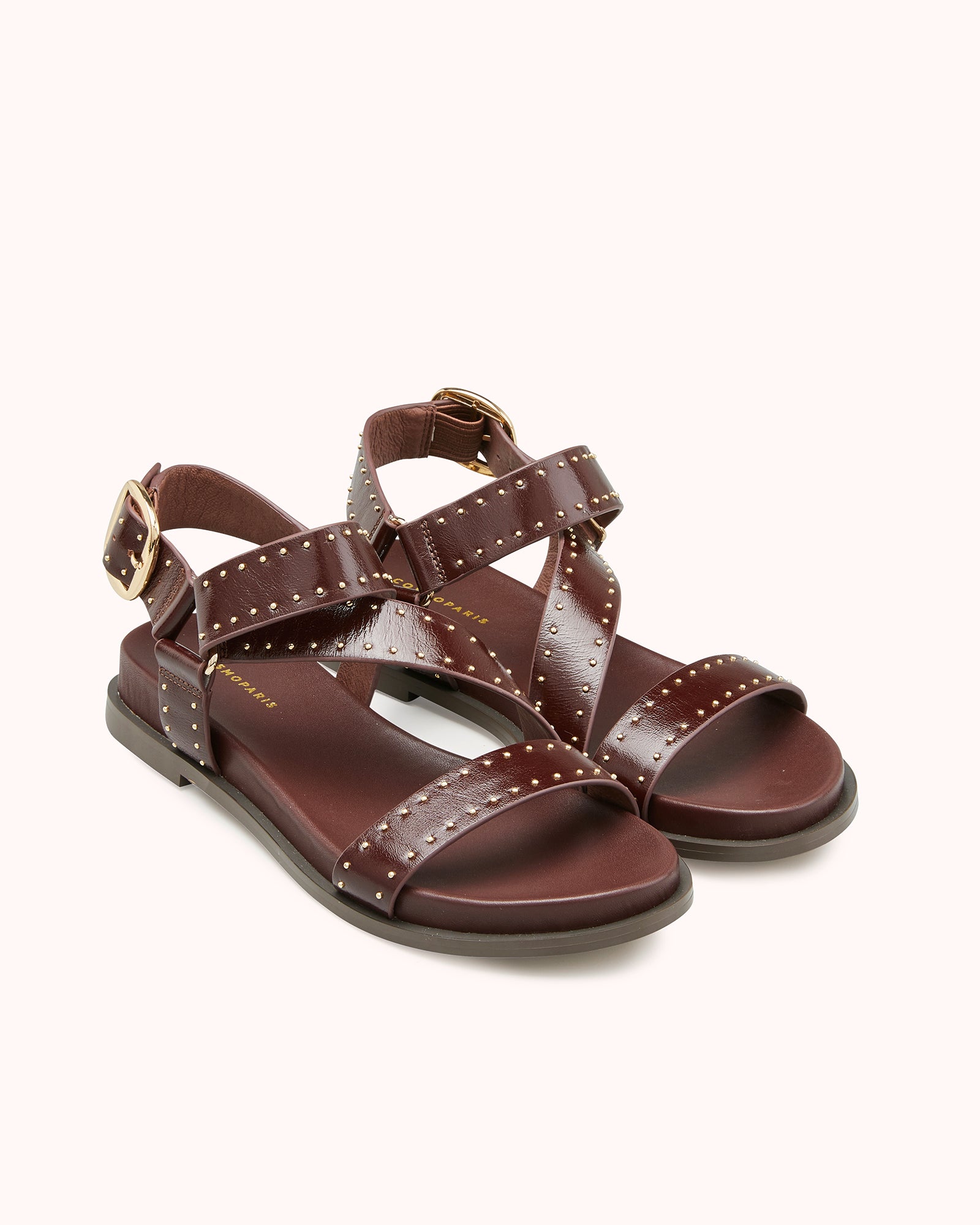 Cette saison, notre modèle HINOU se refait une beauté. Avec sa robe en cuir légèrement craquelé couleur cerise, cette sandale rock et féminine ornée de mini clous dorés saura sublimer vos pieds.