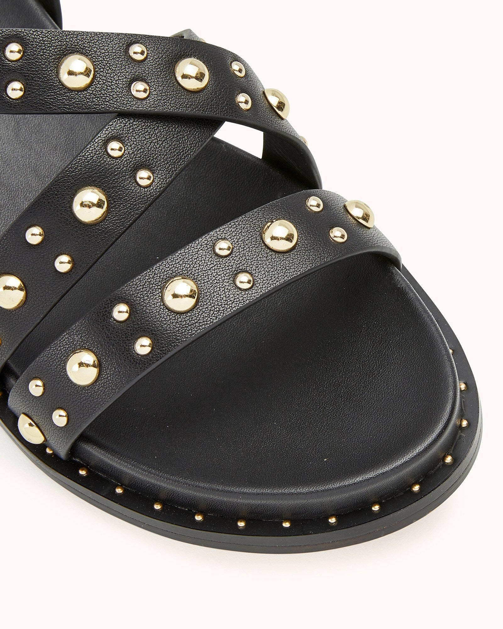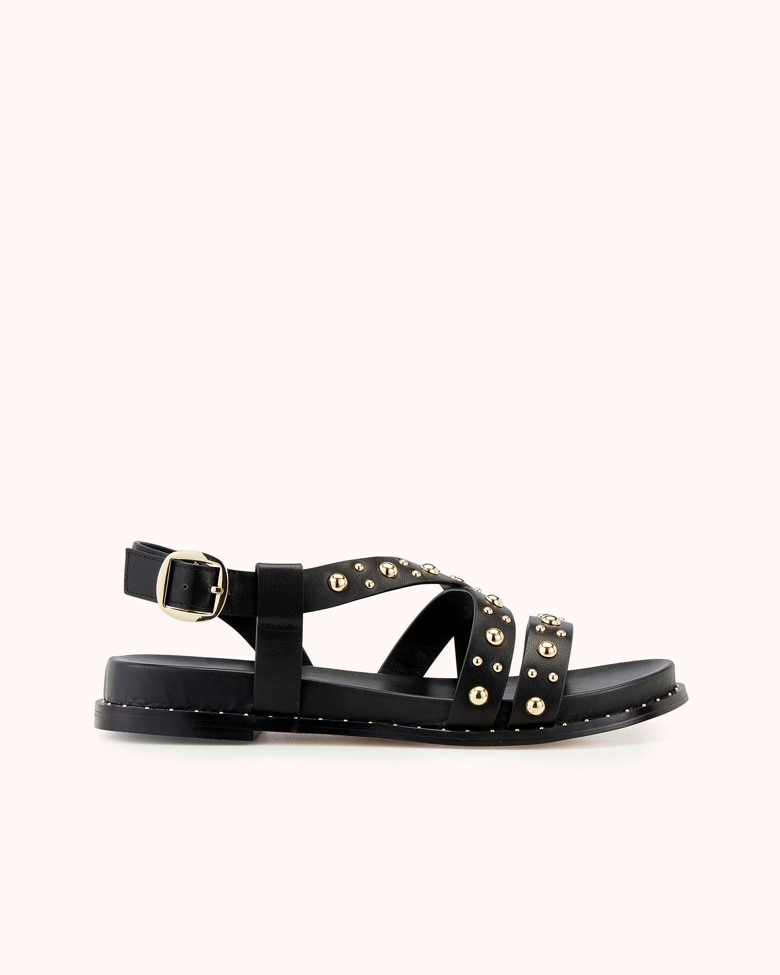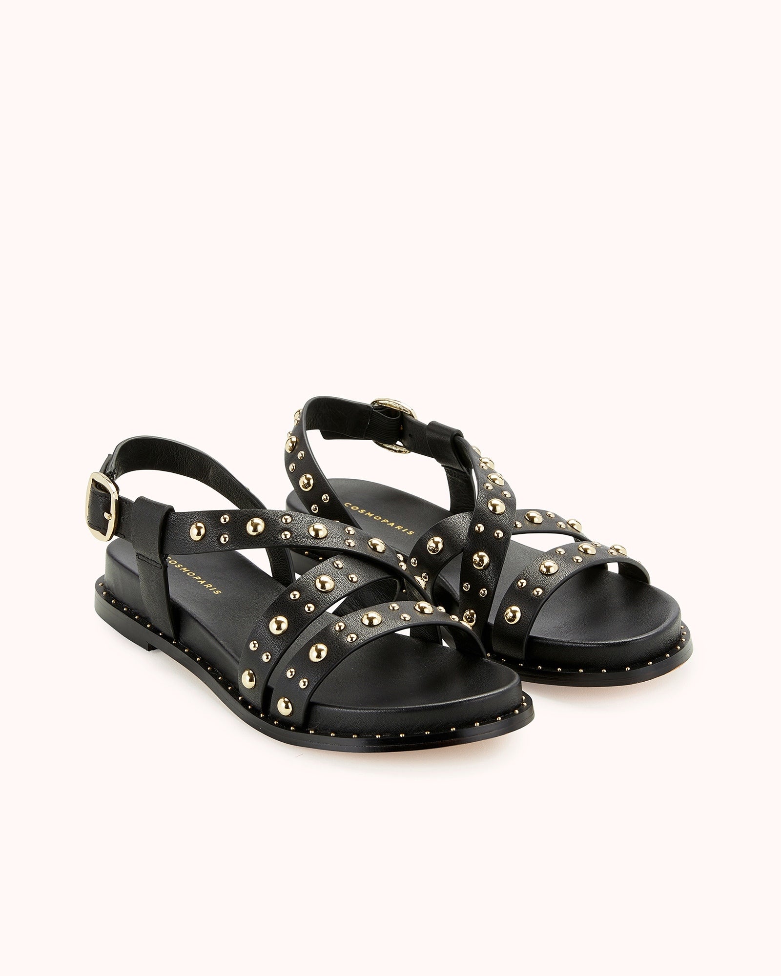 Our HOLINE model, a rock and feminine sandal decorated with gold studs, with its asymmetrical upper, will enhance your everyday looks. This model is made with leather from tanneries certified by the Leather Working Group at the “gold” level.
