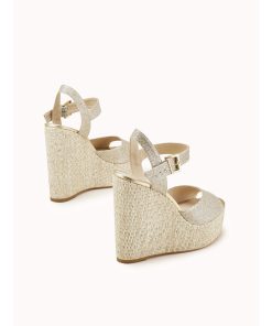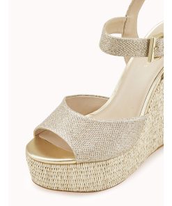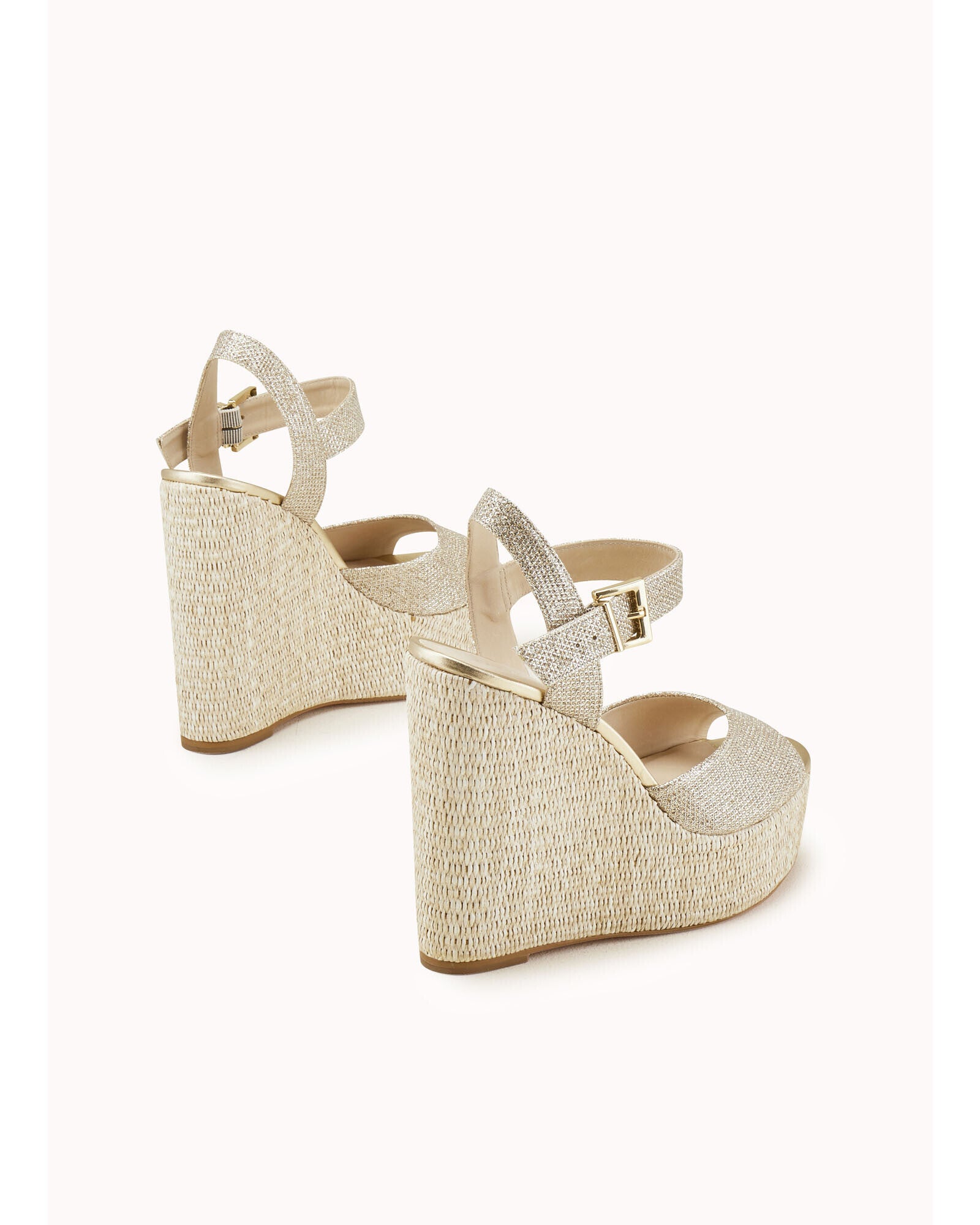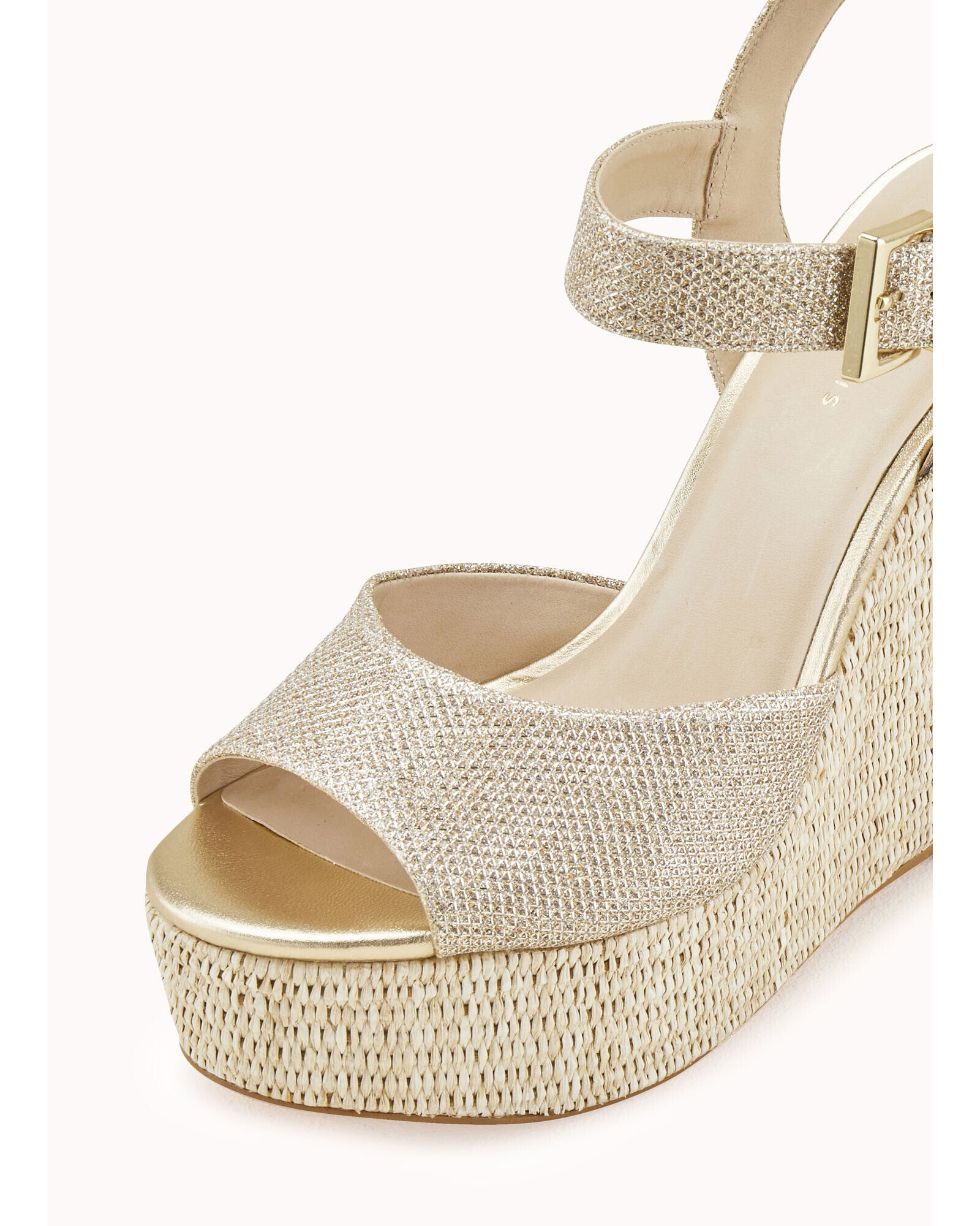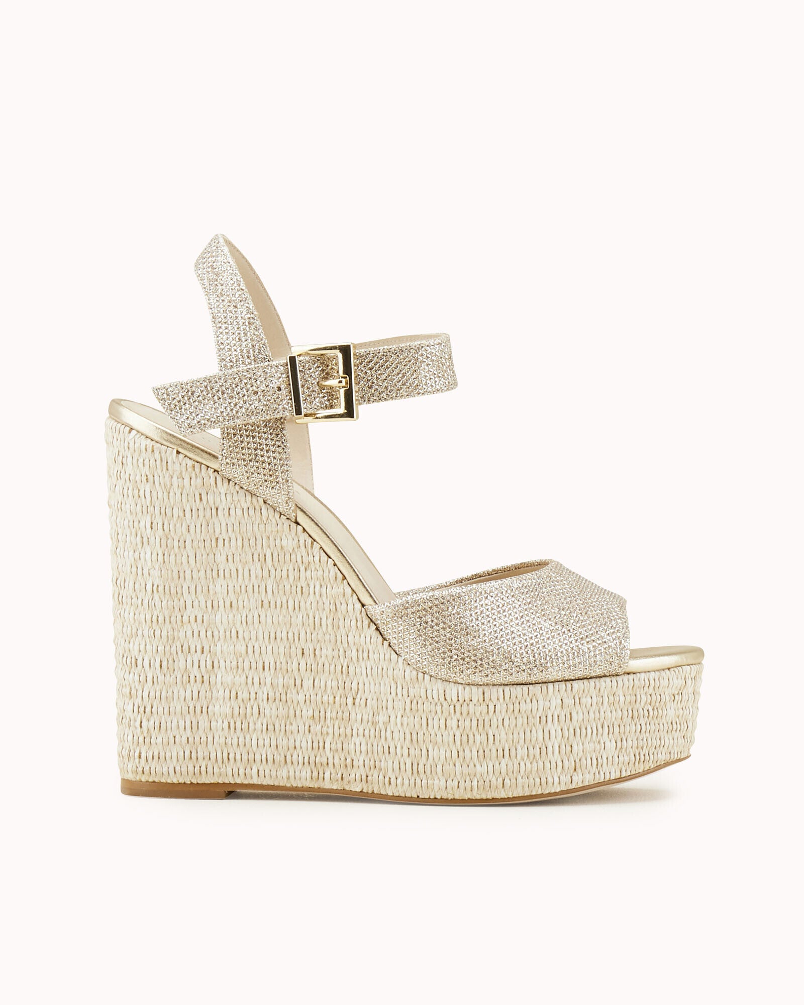 The JAMEA wedge sandal is a must-have in our collections. Its feminine arch will give you an elegant look. Its block covered in natural braided raffia and its glittery upper will make your most beautiful summer looks sparkle.