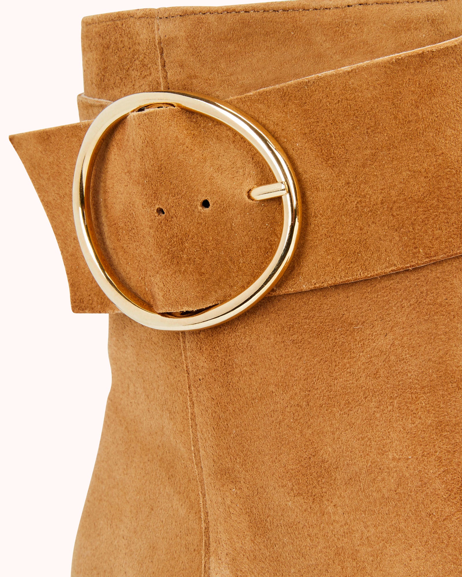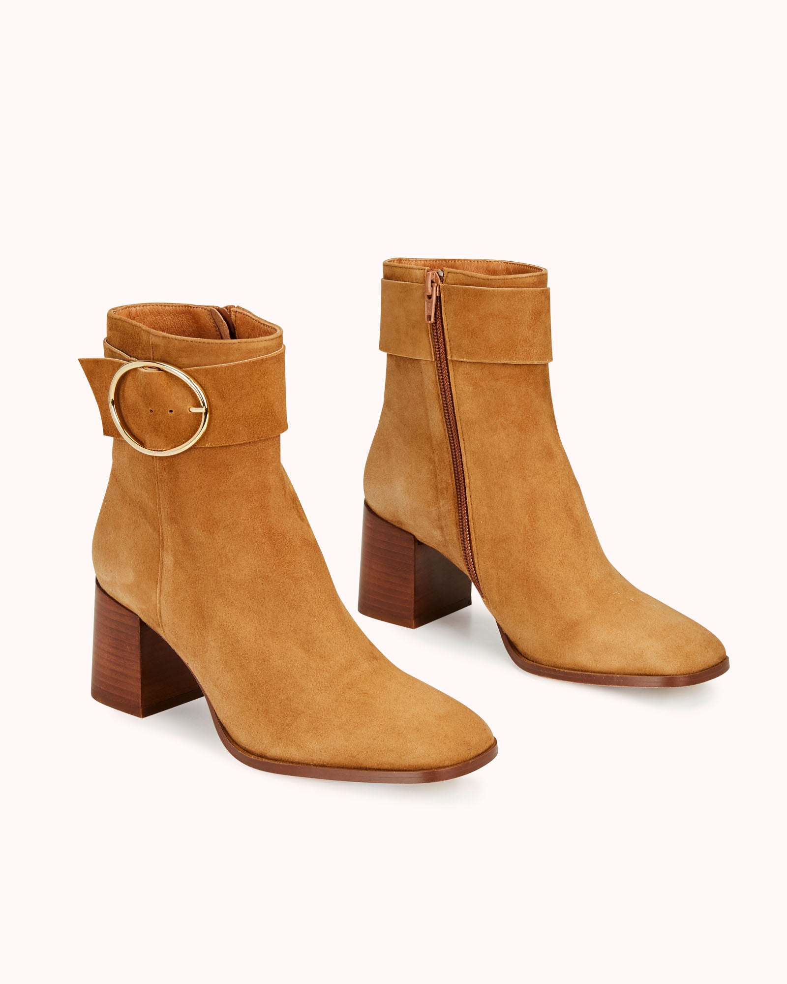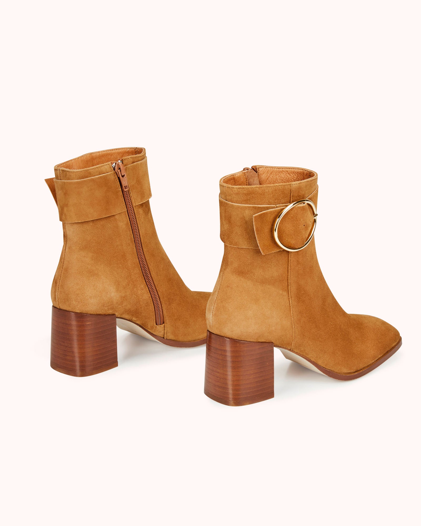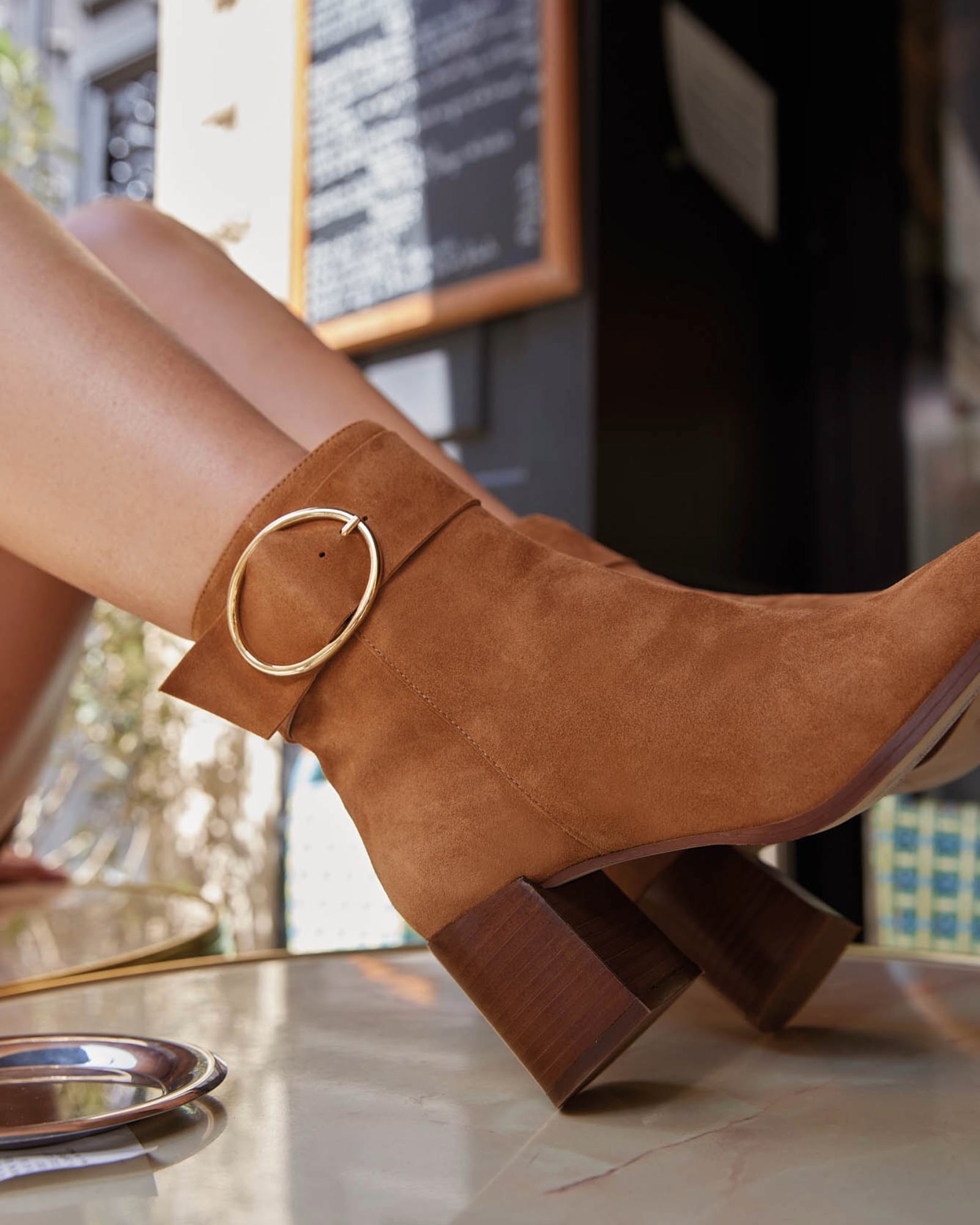 The LUCI is an ankle boot with a 6 cm heel available in smooth black leather and cognac goat suede. Inspired by the 70’s, its square toe and its beautiful golden oval buckle make this new model the new fashionable and feminine must-have in your wardrobe.
