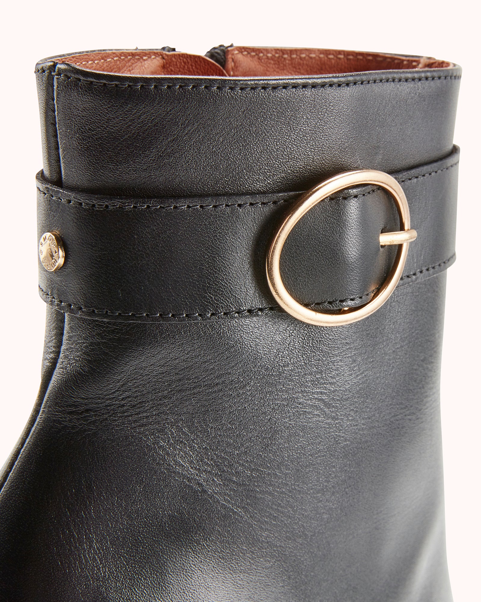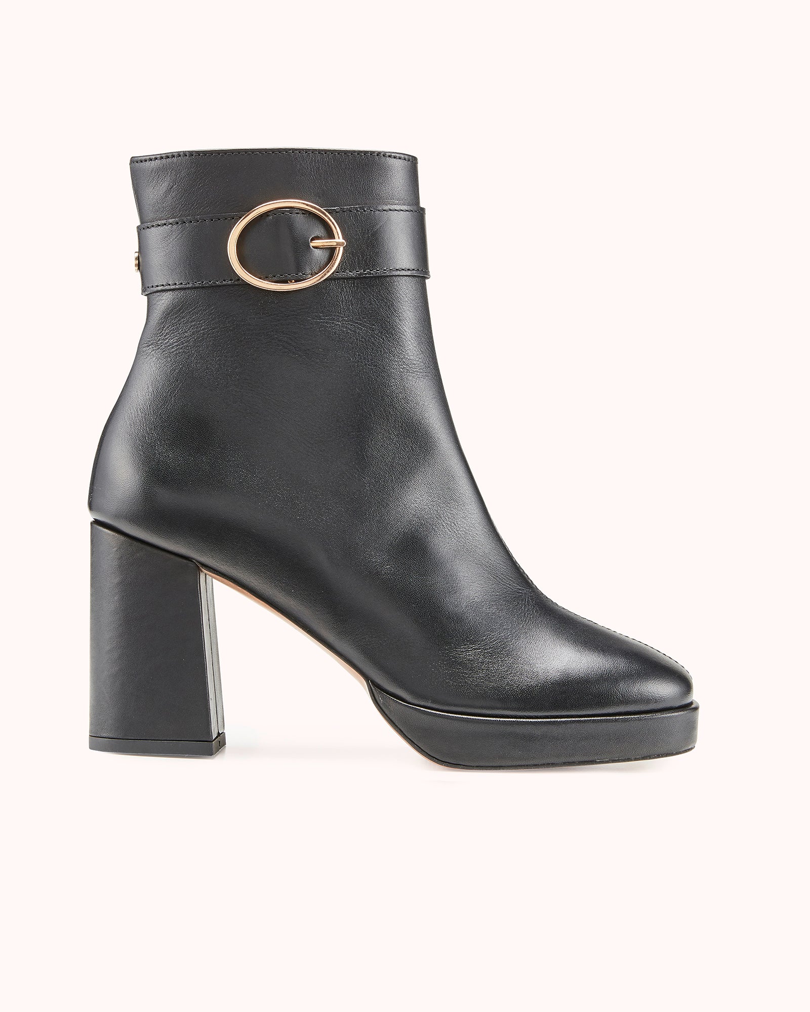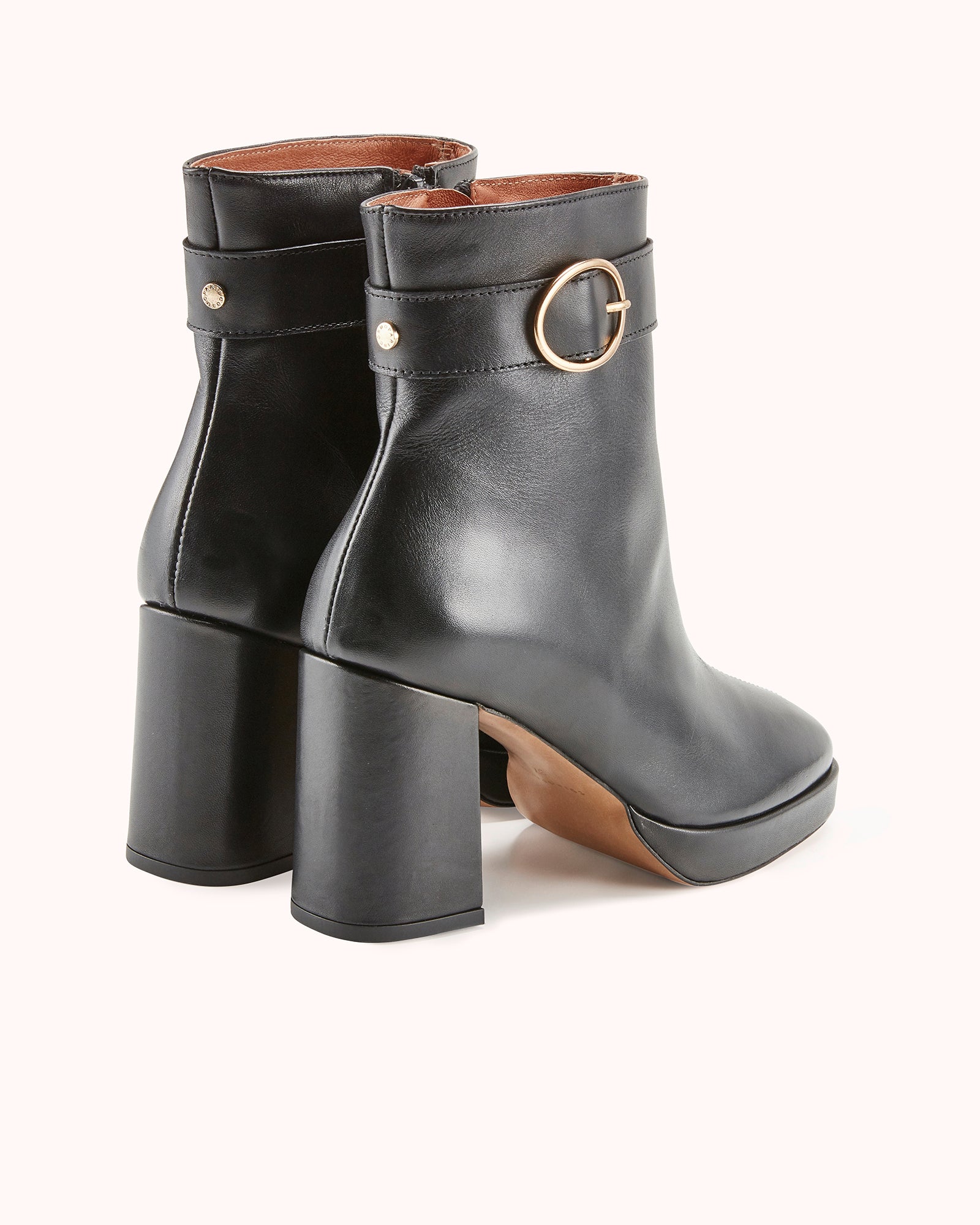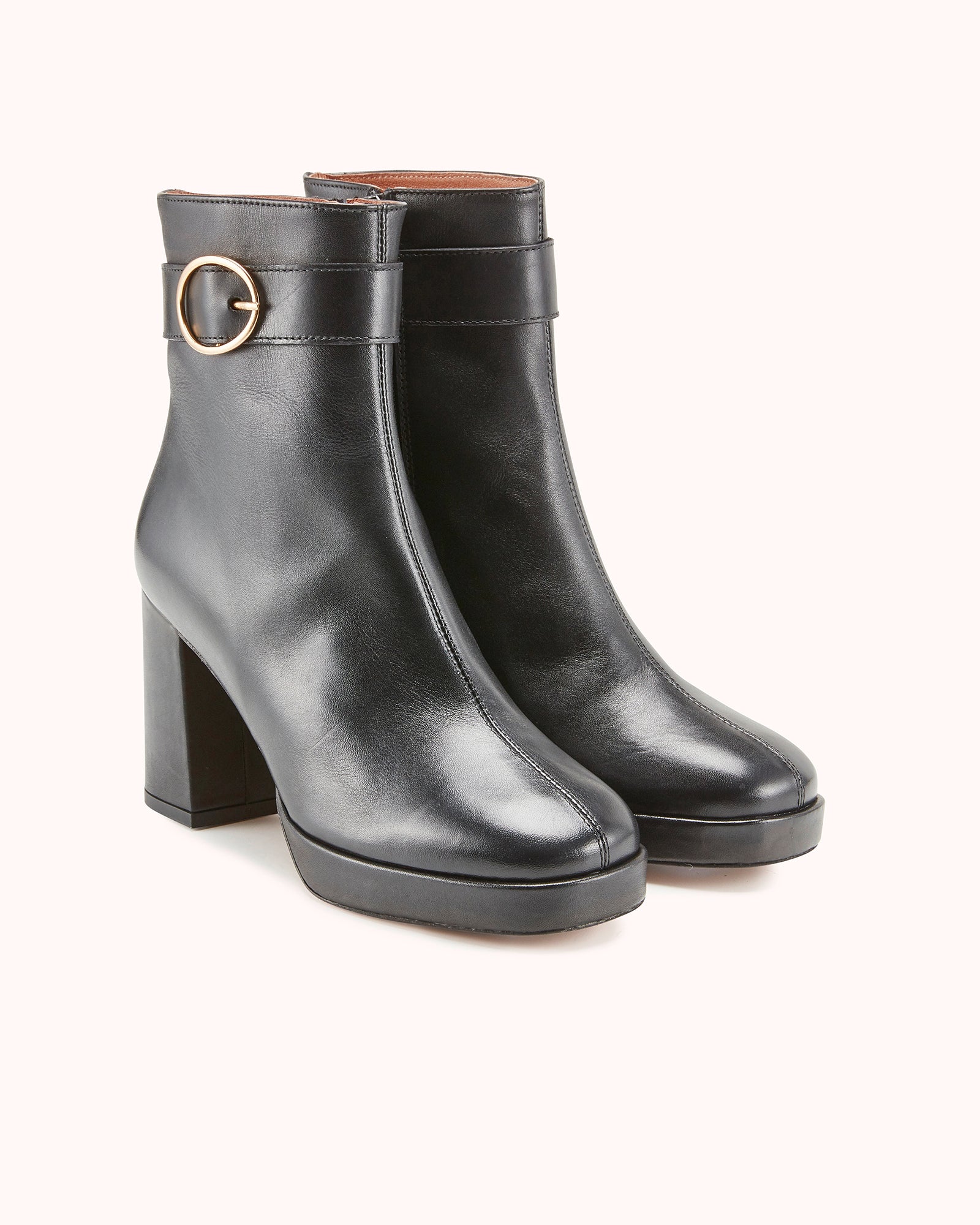 The PIA is an 8 cm heeled ankle boot in black cracked leather. Its 1.5 cm platform, as well as its strap decorated with a gold buckle all around the ankle, make it a chic and trendy pair for this winter.