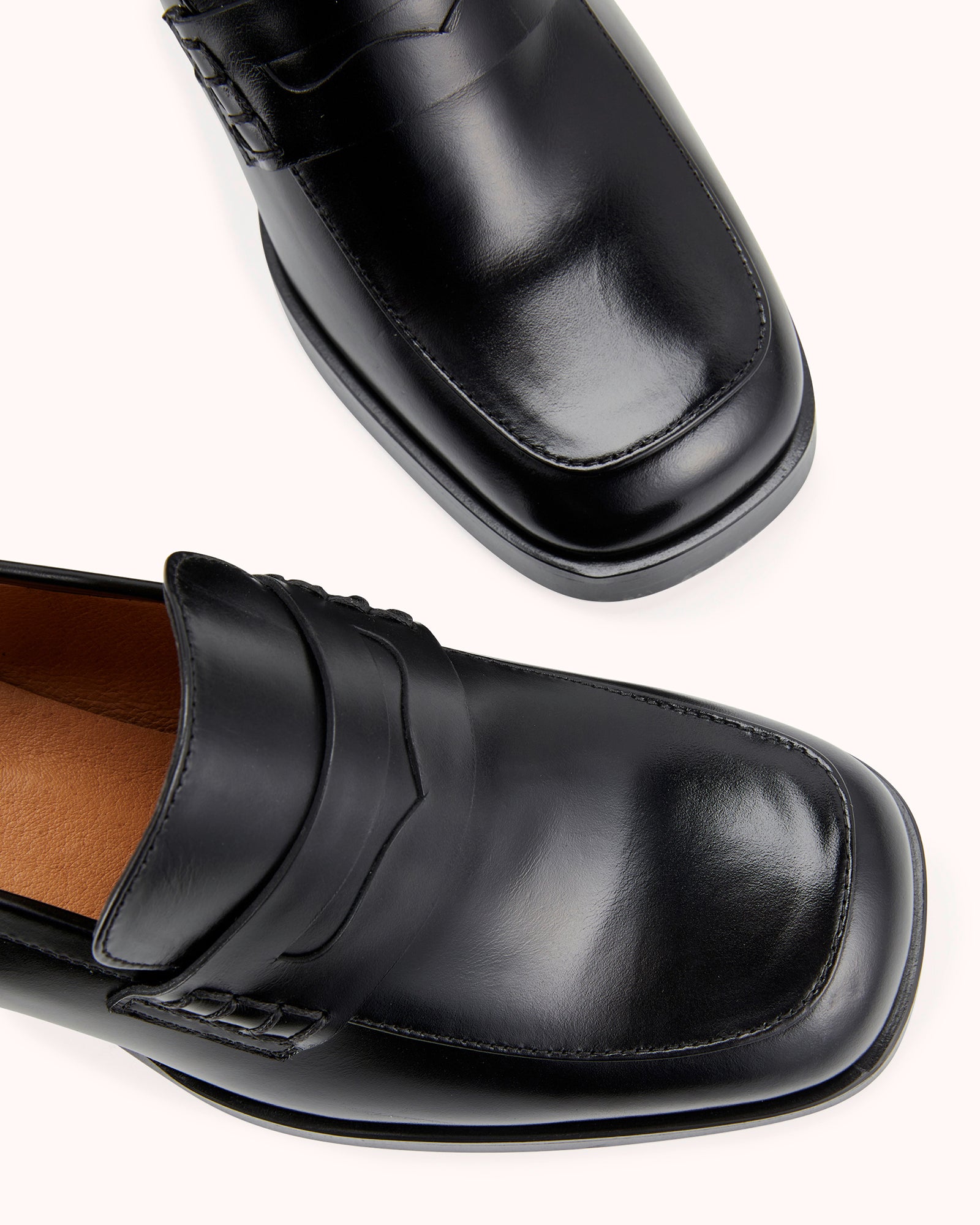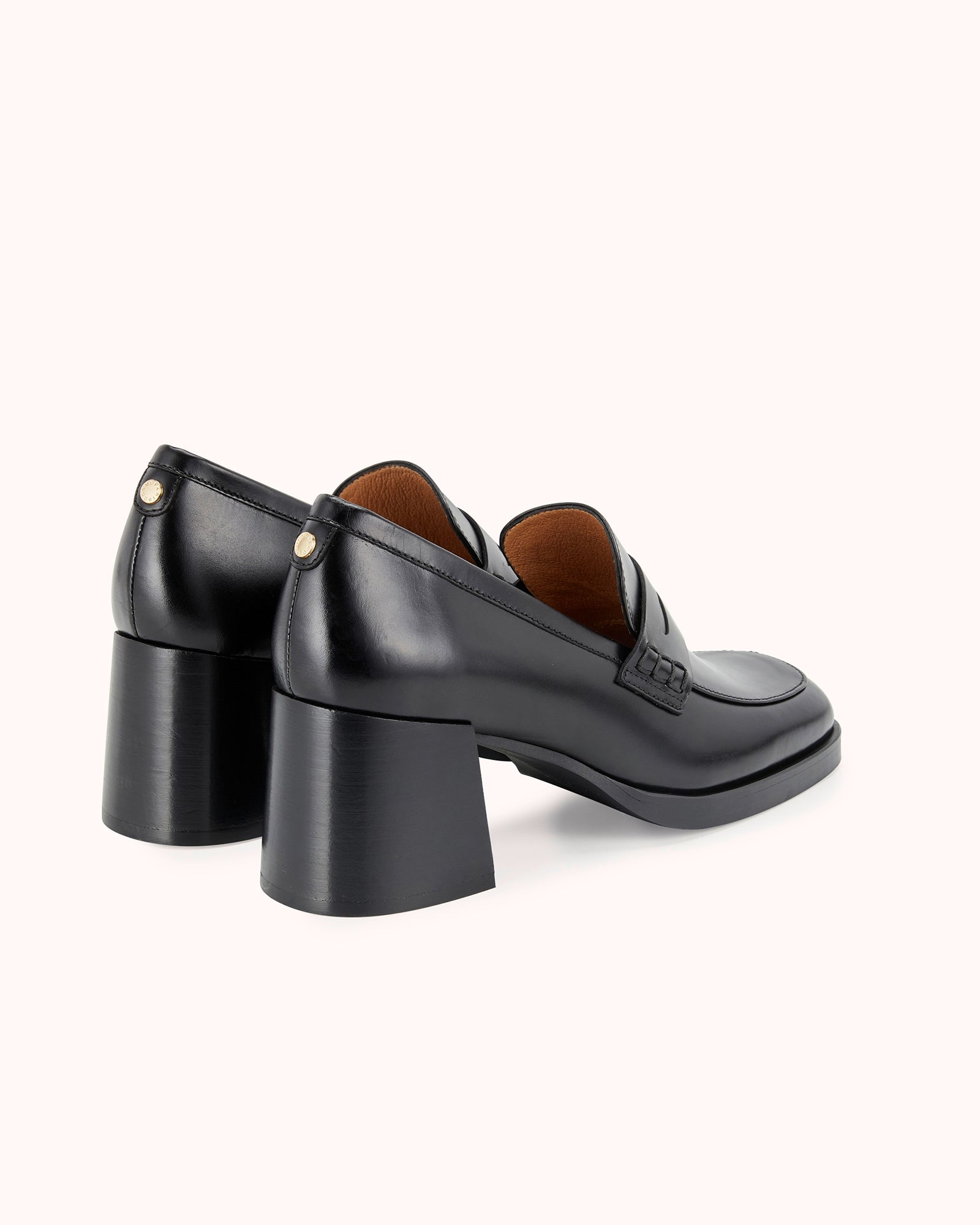 Our PILAR model is a heeled loafer in smooth black leather. With its 6 cm heel and square toe, it is the classic chic pair to have in your wardrobe. Timeless and comfortable, it will be your must-have this fall.